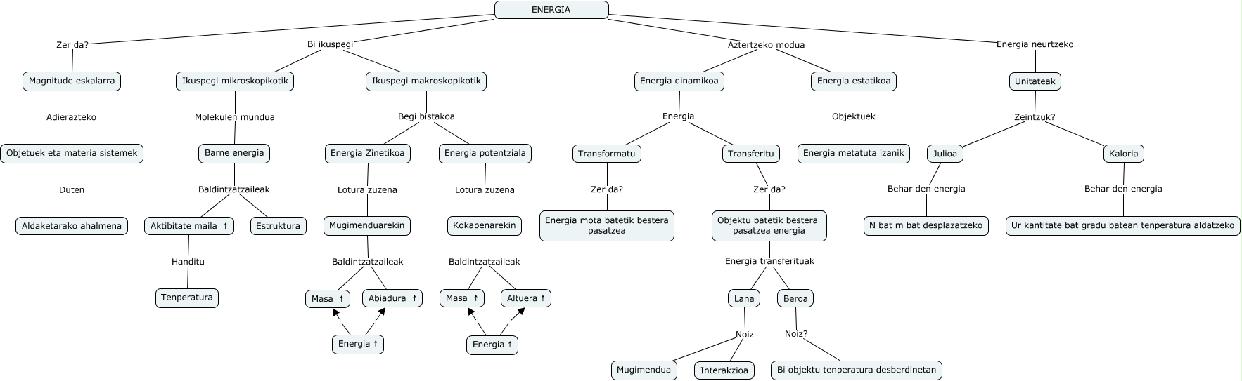 Este Cmap, tiene información relacionada con: hezkuntza_153, Kaloria Behar den energia Ur kantitate bat gradu batean tenperatura aldatzeko, Mugimenduarekin Baldintzatzaileak Masa ↑, Objetuek eta materia sistemek Duten Aldaketarako ahalmena, Kokapenarekin Baldintzatzaileak Altuera ↑, Julioa Behar den energia N bat m bat desplazatzeko, ENERGIA Energia neurtzeko Unitateak, Aktibitate maila ↑ Handitu Tenperatura, Unitateak Zeintzuk? Julioa, Energia ↑ Masa ↑, Ikuspegi makroskopikotik Begi bistakoa Energia Zinetikoa, ENERGIA Aztertzeko modua Energia dinamikoa, ENERGIA Bi ikuspegi Ikuspegi mikroskopikotik, Barne energia Baldintzatzaileak Estruktura, Energia ↑ Abiadura ↑, Barne energia Baldintzatzaileak Aktibitate maila ↑, Objektu batetik bestera pasatzea energia Energia transferituak Lana, Magnitude eskalarra Adierazteko Objetuek eta materia sistemek, Unitateak Zeintzuk? Kaloria, Energia ↑ Altuera ↑, Objektu batetik bestera pasatzea energia Energia transferituak Beroa