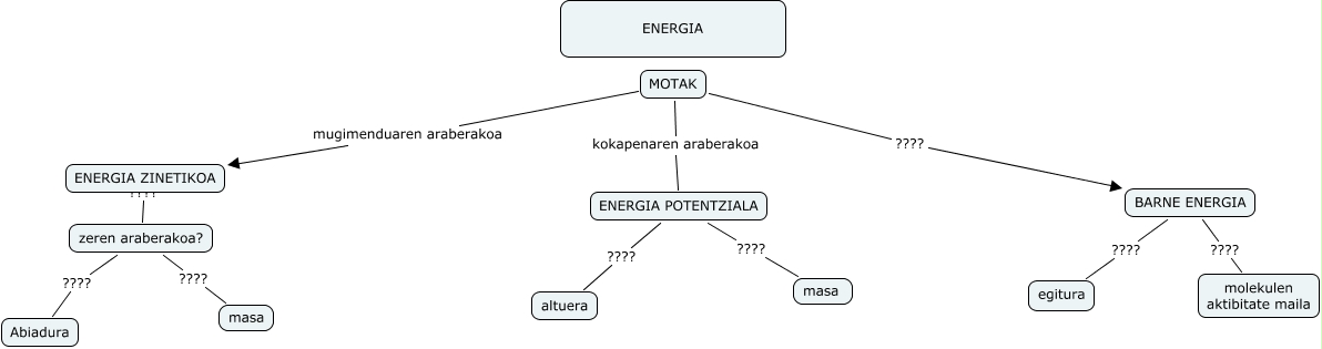 Este Cmap, tiene información relacionada con: hezkuntza47, BARNE ENERGIA ???? molekulen aktibitate maila, zeren araberakoa? ???? masa, zeren araberakoa? ???? ENERGIA ZINETIKOA, MOTAK mugimenduaren araberakoa ENERGIA ZINETIKOA, BARNE ENERGIA ???? egitura, ENERGIA POTENTZIALA ???? masa, MOTAK kokapenaren araberakoa ENERGIA POTENTZIALA, ENERGIA POTENTZIALA ???? altuera, zeren araberakoa? ???? Abiadura, MOTAK ???? BARNE ENERGIA