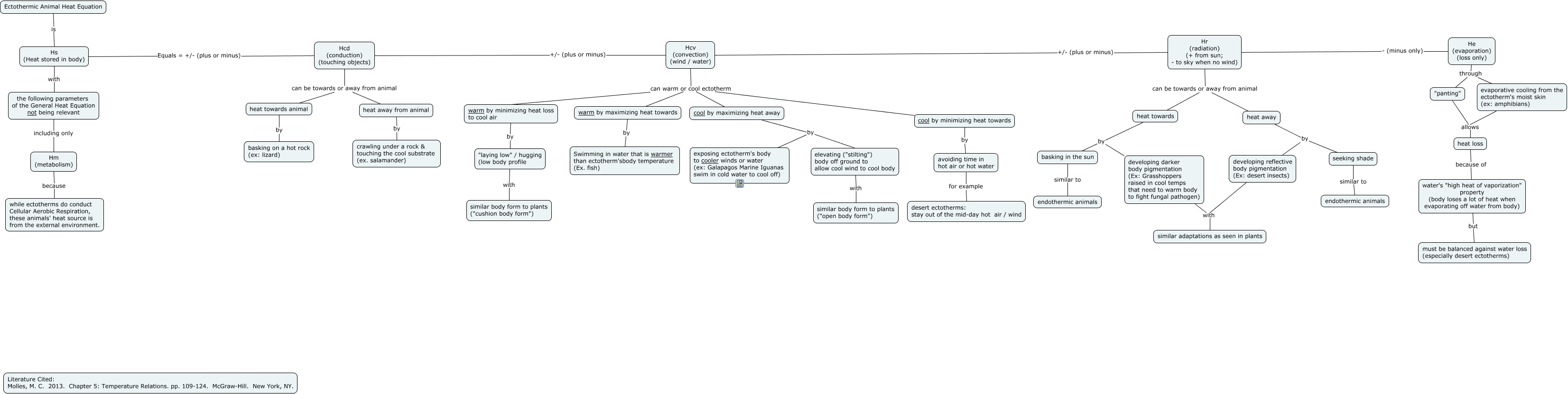This Concept Map, created with IHMC CmapTools, has information related to: Ectothermic Animal Heat Equation, Hcd (conduction) (touching objects) can be towards or away from animal heat away from animal, cool by maximizing heat away by exposing ectotherm's body to cooler winds or water (ex: Galapagos Marine Iguanas swim in cold water to cool off), seeking shade similar to endothermic animals, elevating ("stilting") body off ground to allow cool wind to cool body with similar body form to plants ("open body form"), Hcv (convection) (wind / water) can warm or cool ectotherm warm by minimizing heat loss to cool air, Hcv (convection) (wind / water) +/- (plus or minus) Hr (radiation) (+ from sun; - to sky when no wind), Hcv (convection) (wind / water) can warm or cool ectotherm cool by minimizing heat towards, Hcv (convection) (wind / water) can warm or cool ectotherm warm by maximizing heat towards, evaporative cooling from the ectotherm's moist skin (ex: amphibians) allows heat loss, heat away by seeking shade, heat away by developing reflective body pigmentation (Ex: desert insects), heat towards by developing darker body pigmentation (Ex: Grasshoppers raised in cool temps that need to warm body to fight fungal pathogen), heat away from animal by crawling under a rock & touching the cool substrate (ex. salamander), developing darker body pigmentation (Ex: Grasshoppers raised in cool temps that need to warm body to fight fungal pathogen) with similar adaptations as seen in plants, avoiding time in hot air or hot water for example desert ectotherms: stay out of the mid-day hot air / wind, warm by minimizing heat loss to cool air by "laying low" / hugging (low body profile, cool by maximizing heat away by elevating ("stilting") body off ground to allow cool wind to cool body, heat towards by basking in the sun, Hs (Heat stored in body) Equals = +/- (plus or minus) Hcd (conduction) (touching objects), He (evaporation) (loss only) through "panting"