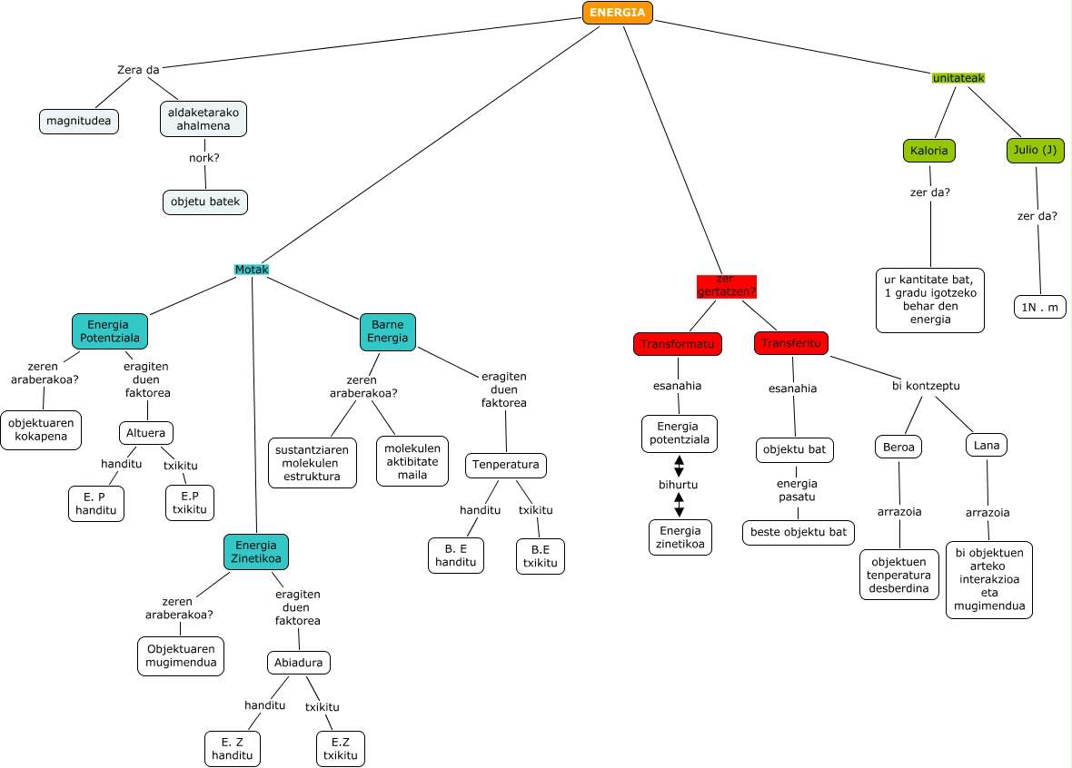 Este Cmap, tiene información relacionada con: hezkuntza_50, ENERGIA Motak Energia Zinetikoa, Tenperatura txikitu B.E txikitu, ENERGIA Zera da aldaketarako ahalmena, ENERGIA zer gertatzen? Transformatu, Energia Zinetikoa zeren araberakoa? Objektuaren mugimendua, Lana arrazoia bi objektuen arteko interakzioa eta mugimendua, Transferitu bi kontzeptu Lana, Abiadura txikitu E.Z txikitu, Transformatu esanahia Energia potentziala, Altuera handitu E. P handitu, Barne Energia zeren araberakoa? molekulen aktibitate maila, ENERGIA Zera da magnitudea, ENERGIA unitateak Kaloria, Barne Energia zeren araberakoa? sustantziaren molekulen estruktura, Energia Potentziala eragiten duen faktorea Altuera, ENERGIA Motak Barne Energia, aldaketarako ahalmena nork? objetu batek, Julio (J) zer da? 1N . m, Tenperatura handitu B. E handitu, ENERGIA zer gertatzen? Transferitu
