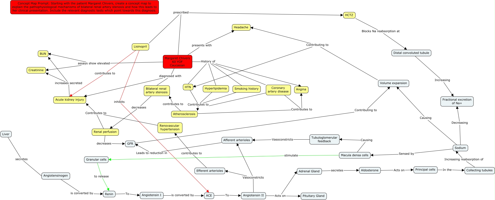 This Concept Map, created with IHMC CmapTools, has information related to: week 26 margaret chivers, Efferent arterioles contributes to Renovascular hypertension, Margaret Chivers 60 YOF Caucasian assays show elevated BUN, Lisinopril contributes to Acute kidney injury, Acute kidney injury increases secreted Creatinine, Margaret Chivers 60 YOF Caucasian prescribed Lisinopril, Angiotensin I is converted by ACE, Margaret Chivers 60 YOF Caucasian presents with Headache, Margaret Chivers 60 YOF Caucasian History of Hyperlipidemia, HCTZ Blocks Na reabsorption at Distal convoluted tubule, Volume expansion Contributing to HTN, Margaret Chivers 60 YOF Caucasian diagnosed with Bilateral renal artery stenosis, Collecting tubules Increasing reabsorption of Sodium, Margaret Chivers 60 YOF Caucasian History of Coronary artery disease, Macula densa cells stimulate Granular cells, Tubuloglomerular feedback Vasoconstricts Afferent arterioles, Principal cells In the Collecting tubules, Angiotensin II Acts on Pituitary Gland, Renal perfusion Contributes to Acute kidney injury, Coronary artery disease Contributes to Atherosclerosis, Aldosterone Acts on Principal cells