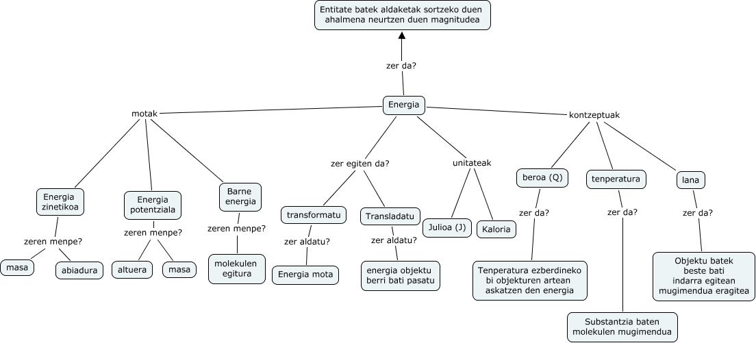 Este Cmap, tiene información relacionada con: hezkuntza_44, Transladatu zer aldatu? energia objektu berri bati pasatu, Energia potentziala zeren menpe? masa, Barne energia zeren menpe? molekulen egitura, Energia potentziala zeren menpe? altuera, Energia zer da? Entitate batek aldaketak sortzeko duen ahalmena neurtzen duen magnitudea, transformatu zer aldatu? Energia mota, tenperatura zer da? Substantzia baten molekulen mugimendua, Energia motak Energia potentziala, Energia zinetikoa zeren menpe? abiadura, Energia motak Barne energia, Energia unitateak Julioa (J), Energia kontzeptuak tenperatura, Energia kontzeptuak lana, Energia zinetikoa zeren menpe? masa, lana zer da? Objektu batek beste bati indarra egitean mugimendua eragitea, Energia unitateak Kaloria, beroa (Q) zer da? Tenperatura ezberdineko bi objekturen artean askatzen den energia, Energia motak Energia zinetikoa, Energia kontzeptuak beroa (Q), Energia zer egiten da? Transladatu