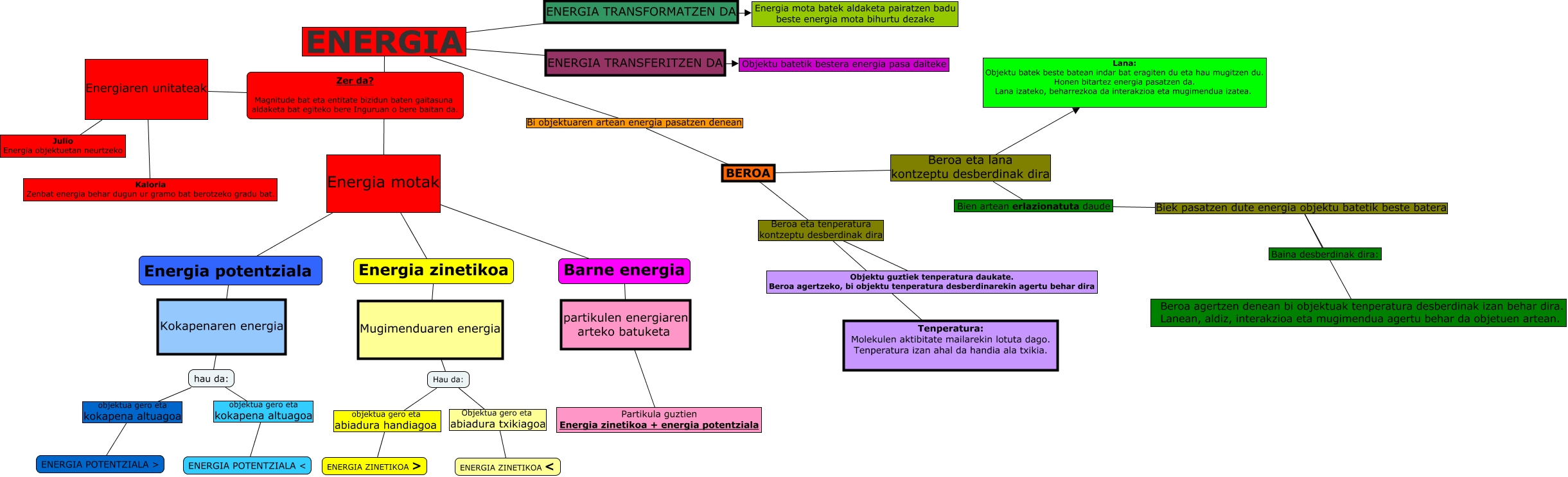 Este Cmap, tiene información relacionada con: Hezkuntza_72, BEROA Beroa eta tenperatura kontzeptu desberdinak dira Tenperatura: Molekulen aktibitate mailarekin lotuta dago. Tenperatura izan ahal da handia ala txikia., Zer da? Magnitude bat eta entitate bizidun baten gaitasuna aldaketa bat egiteko bere Inguruan o bere baitan da. Energiaren unitateak Julio Energia objektuetan neurtzeko, hau da: objektua gero eta kokapena altuagoa ENERGIA POTENTZIALA <, BEROA Beroa eta lana kontzeptu desberdinak dira Bien artean erlazionatuta daude, Hau da: objektua gero eta abiadura handiagoa ENERGIA ZINETIKOA >, Energia potentziala Kokapenaren energia hau da:, hau da: objektua gero eta kokapena altuagoa ENERGIA POTENTZIALA >, ENERGIA Energia motak Energia zinetikoa, ENERGIA Energia motak Energia potentziala, Bien artean erlazionatuta daude Biek pasatzen dute energia objektu batetik beste batera Baina desberdinak dira:, BEROA Beroa eta tenperatura kontzeptu desberdinak dira Objektu guztiek tenperatura daukate. Beroa agertzeko, bi objektu tenperatura desberdinarekin agertu behar dira, Barne energia partikulen energiaren arteko batuketa Partikula guztien Energia zinetikoa + energia potentziala, ENERGIA ENERGIA TRANSFERITZEN DA Objektu batetik bestera energia pasa daiteke, ENERGIA Bi objektuaren artean energia pasatzen denean BEROA, Bien artean erlazionatuta daude Biek pasatzen dute energia objektu batetik beste batera Beroa agertzen denean bi objektuak tenperatura desberdinak izan behar dira. Lanean, aldiz, interakzioa eta mugimendua agertu behar da objetuen artean., Energia zinetikoa Mugimenduaren energia Hau da:, Zer da? Magnitude bat eta entitate bizidun baten gaitasuna aldaketa bat egiteko bere Inguruan o bere baitan da. Energiaren unitateak Kaloria Zenbat energia behar dugun ur gramo bat berotzeko gradu bat., ENERGIA ENERGIA TRANSFORMATZEN DA Energia mota batek aldaketa pairatzen badu beste energia mota bihurtu dezake, ENERGIA Energia motak Barne energia, BEROA Beroa eta lana kontzeptu desberdinak dira Lana: Objektu batek beste batean indar bat eragiten du eta hau mugitzen du. Honen bitartez energia pasatzen da. Lana izateko, beharrezkoa da interakzioa eta mugimendua izatea.