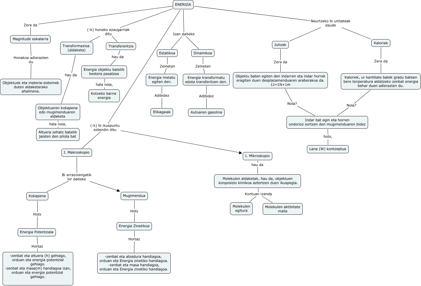 Este Cmap, tiene información relacionada con: hezkuntza 59, Mugimendua Hots Energia Zinetikoa, ENERGIA Izan daiteke Dinamikoa, Indar bat egin eta horren ondorioz sortzen den mugimenduaren bidez hots, Lana (W) kontzeptua, I. Mikroskopio hau da Molekulen aldaketak, hau da, objektuen konposizio kimikoa aztertzen duen ikuspegia., Kokapena Hots Energia Potentziala, Magnitude eskalarra Honakoa adierazten du Objektuek eta materia-sistemek duten aldaketarako ahalmena., ENERGIA (-k) bi ikuspuntu ezberdin ditu I. Makroskopio, Transformazioa (aldaketa) hau da Objektuaren kokapena edo mugimenduaren aldaketa, ENERGIA Neurtzeko bi unitateak daude Kaloriak, Objektuaren kokapena edo mugimenduaren aldaketa hala nola, Altuera zehatz batetik jaisten den pilota bat, Energia transformatu edota transferitzen den. Adibidez Autoaren gasolina, Molekulen aldaketak, hau da, objektuen konposizio kimikoa aztertzen duen ikuspegia. Kontuan izanda Molekulen aktibitate maila, Julioak Zera da Objektu baten egiten den indarren eta indar horrek eragiten duen desplazamenduaren araberakoa da. 1J=1N+1m, Energia objektu batetik bestera pasatzea hala nola, Kotxeko barne energia, ENERGIA (-k) honako ezaugarriak ditu Transformazioa (aldaketa), I. Makroskopio Bi arrazoiengatik lor daiteke Mugimendua, I. Makroskopio Bi arrazoiengatik lor daiteke Kokapena, Estatikoa Zeinetan Energia metatu egiten den., ENERGIA (-k) honako ezaugarriak ditu Transferentzia, Energia Zinetikoa Hortaz -zenbat eta abiadura handiagoa, orduan eta Energia zinetiko handiagoa. -zenbat eta masa handiagoa, orduan eta Energia zinetiko handiagoa.