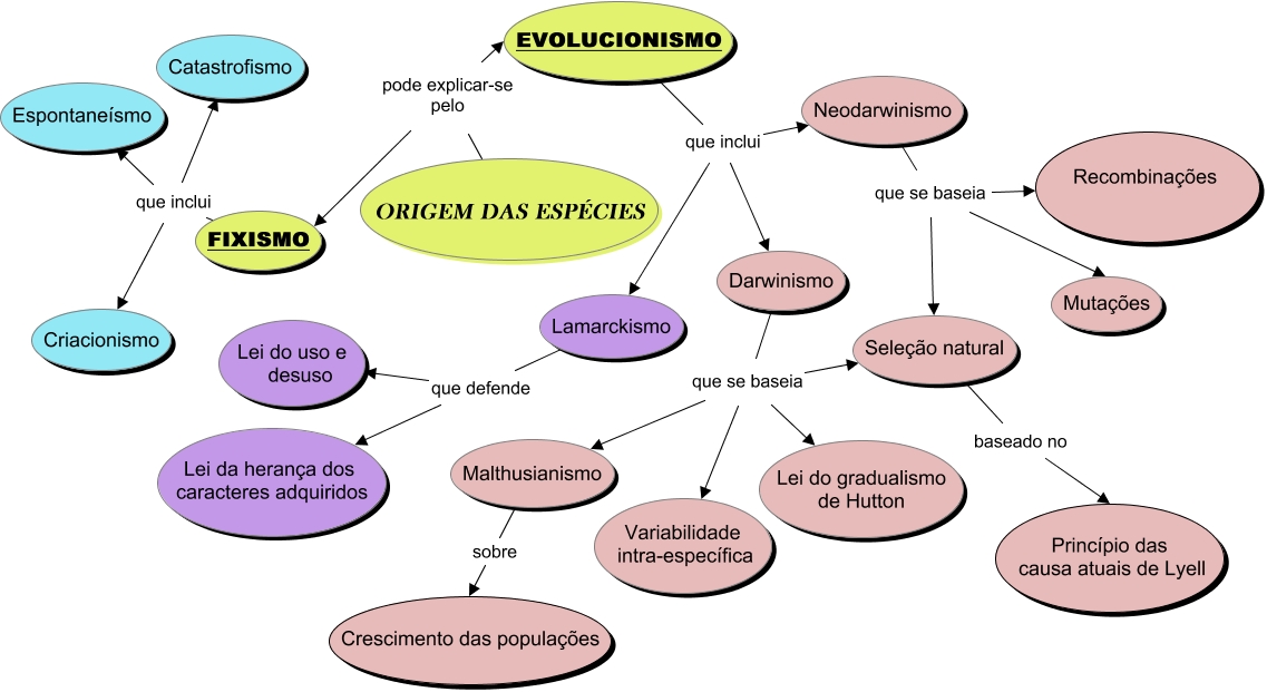 Esse mapa conceitual, produzido no IHMC CmapTools, tem a informação relacionada a: Origem das especies, FIXISMO que inclui Catastrofismo, FIXISMO que inclui Espontaneísmo, Darwinismo que se baseia Lei do gradualismo de Hutton, Malthusianismo sobre Crescimento das populações, Lamarckismo que defende Lei da herança dos caracteres adquiridos, Seleção natural baseado no Princípio das causa atuais de Lyell, Neodarwinismo que se baseia Seleção natural, Neodarwinismo que se baseia Mutações, Darwinismo que se baseia Seleção natural, EVOLUCIONISMO que inclui Darwinismo, FIXISMO que inclui Criacionismo, EVOLUCIONISMO que inclui Lamarckismo, ORIGEM DAS ESPÉCIES pode explicar-se pelo EVOLUCIONISMO, Darwinismo que se baseia Malthusianismo, ORIGEM DAS ESPÉCIES pode explicar-se pelo FIXISMO, Darwinismo que se baseia Variabilidade intra-específica, Neodarwinismo que se baseia Recombinações, EVOLUCIONISMO que inclui Neodarwinismo, Lamarckismo que defende Lei do uso e desuso
