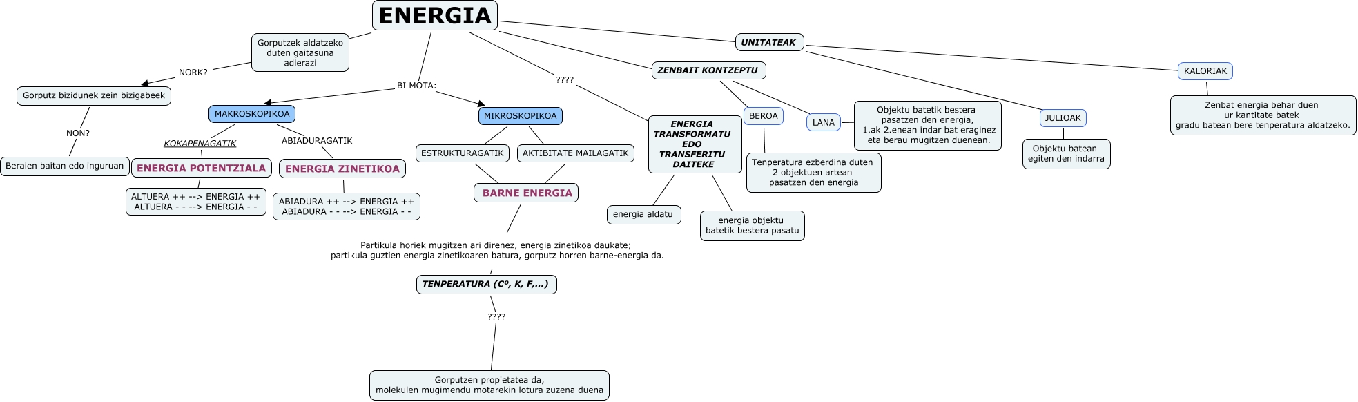 Este Cmap, tiene información relacionada con: hezkuntza_peio, ENERGIA ???? ZENBAIT KONTZEPTU, MIKROSKOPIKOA ???? AKTIBITATE MAILAGATIK, JULIOAK Zer da? Objektu batean egiten den indarra, ENERGIA TRANSFORMATU EDO TRANSFERITU DAITEKE ???? energia objektu batetik bestera pasatu, ENERGIA TRANSFORMATU EDO TRANSFERITU DAITEKE ???? energia aldatu, ENERGIA BI MOTA: MIKROSKOPIKOA, ZENBAIT KONTZEPTU ???? BEROA, Gorputz bizidunek zein bizigabeek NON? Beraien baitan edo inguruan, UNITATEAK ???? KALORIAK, ESTRUKTURAGATIK ???? BARNE ENERGIA, ENERGIA ???? UNITATEAK, TENPERATURA (Cº, K, F,...) ???? Gorputzen propietatea da, molekulen mugimendu motarekin lotura zuzena duena, BEROA Zer da? Tenperatura ezberdina duten 2 objektuen artean pasatzen den energia, Gorputzek aldatzeko duten gaitasuna adierazi NORK? Gorputz bizidunek zein bizigabeek, MAKROSKOPIKOA KOKAPENAGATIK ENERGIA POTENTZIALA, LANA Zer da? Objektu batetik bestera pasatzen den energia, 1.ak 2.enean indar bat eraginez eta berau mugitzen duenean., ENERGIA ZINETIKOA ???? ABIADURA ++ --> ENERGIA ++ ABIADURA - - --> ENERGIA - -, ENERGIA POTENTZIALA ???? ALTUERA ++ --> ENERGIA ++ ALTUERA - - --> ENERGIA - -, ENERGIA BI MOTA: MAKROSKOPIKOA, MIKROSKOPIKOA ???? ESTRUKTURAGATIK