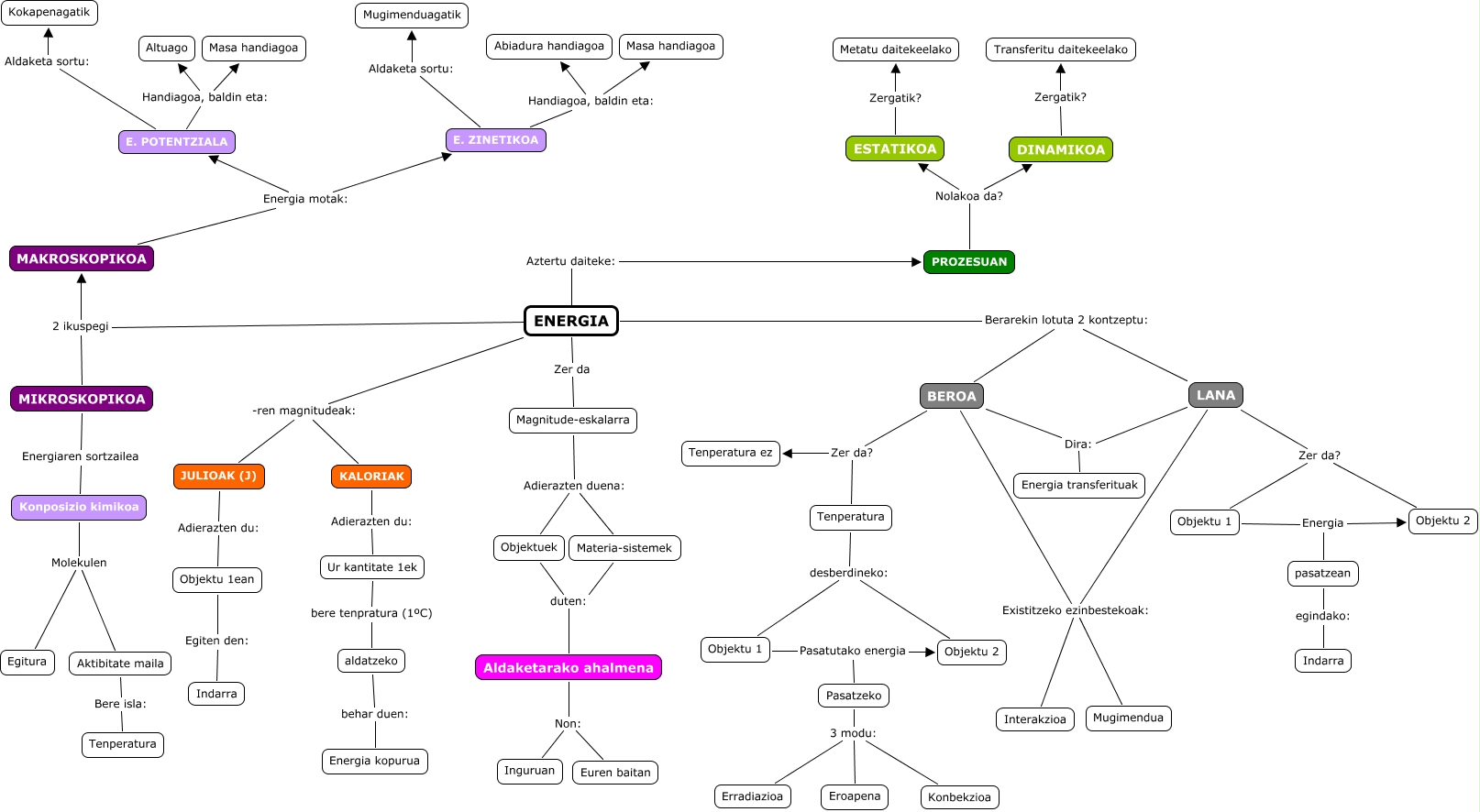 Este Cmap, tiene información relacionada con: Hezkuntza_61, Objektu 1 Energia pasatzean, E. ZINETIKOA Handiagoa, baldin eta: Masa handiagoa, KALORIAK Adierazten du: Ur kantitate 1ek, Magnitude-eskalarra Adierazten duena: Materia-sistemek, MAKROSKOPIKOA Energia motak: E. POTENTZIALA, LANA Existitzeko ezinbestekoak: Mugimendua, Konposizio kimikoa Molekulen Aktibitate maila, E. ZINETIKOA Aldaketa sortu: Mugimenduagatik, ESTATIKOA Zergatik? Metatu daitekeelako, Objektuek duten: Aldaketarako ahalmena, E. POTENTZIALA Handiagoa, baldin eta: Masa handiagoa, Objektu 1 Pasatutako energia Pasatzeko, ENERGIA Berarekin lotuta 2 kontzeptu: BEROA, BEROA Zer da? Tenperatura, BEROA Existitzeko ezinbestekoak: Interakzioa, LANA Zer da? Objektu 2, JULIOAK (J) Adierazten du: Objektu 1ean, Materia-sistemek duten: Aldaketarako ahalmena, MAKROSKOPIKOA Energia motak: E. ZINETIKOA, MIKROSKOPIKOA Energiaren sortzailea Konposizio kimikoa