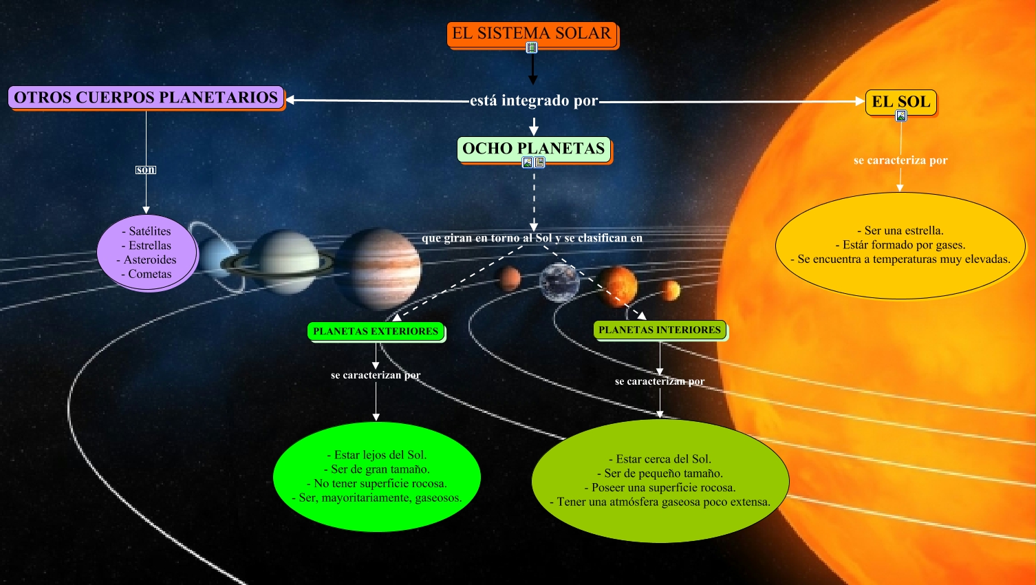 Este Cmap, tiene información relacionada con: El Sistema SolarDEFINITIVO.cmap, EL SISTEMA SOLAR está integrado por OCHO PLANETAS, PLANETAS EXTERIORES se caracterizan por - Estar lejos del Sol. - Ser de gran tamaño. - No tener superficie rocosa. - Ser, mayoritariamente, gaseosos., EL SISTEMA SOLAR está integrado por EL SOL, EL SOL se caracteriza por - Ser una estrella. - Estár formado por gases. - Se encuentra a temperaturas muy elevadas., OTROS CUERPOS PLANETARIOS son - Satélites - Estrellas - Asteroides - Cometas, OCHO PLANETAS que giran en torno al Sol y se clasifican en PLANETAS INTERIORES, PLANETAS INTERIORES se caracterizan por - Estar cerca del Sol. - Ser de pequeño tamaño. - Poseer una superficie rocosa. - Tener una atmósfera gaseosa poco extensa., EL SISTEMA SOLAR está integrado por OTROS CUERPOS PLANETARIOS, OCHO PLANETAS que giran en torno al Sol y se clasifican en PLANETAS EXTERIORES