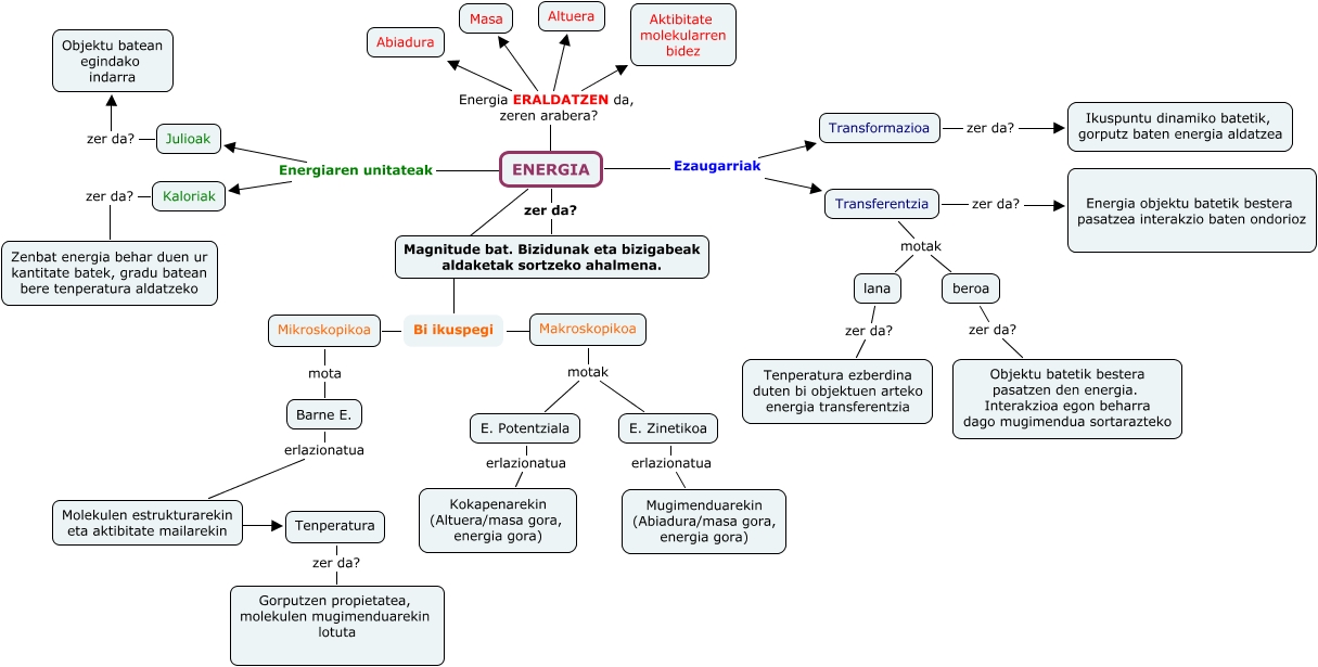 Este Cmap, tiene información relacionada con: Hezkuntza_28, Julioak zer da? Objektu batean egindako indarra, ENERGIA Ezaugarriak Transferentzia, E. Zinetikoa erlazionatua Mugimenduarekin (Abiadura/masa gora, energia gora), E. Potentziala erlazionatua Kokapenarekin (Altuera/masa gora, energia gora), Bi ikuspegi ???? Mikroskopikoa, lana zer da? Tenperatura ezberdina duten bi objektuen arteko energia transferentzia, Transferentzia motak beroa, ENERGIA zer da? Magnitude bat. Bizidunak eta bizigabeak aldaketak sortzeko ahalmena., Barne E. erlazionatua Molekulen estrukturarekin eta aktibitate mailarekin, ENERGIA Energiaren unitateak Julioak, Tenperatura zer da? Gorputzen propietatea, molekulen mugimenduarekin lotuta, ENERGIA Energia ERALDATZEN da, zeren arabera? Aktibitate molekularren bidez, beroa zer da? Objektu batetik bestera pasatzen den energia. Interakzioa egon beharra dago mugimendua sortarazteko, ENERGIA ???? Bi ikuspegi, Molekulen estrukturarekin eta aktibitate mailarekin ???? Tenperatura, ENERGIA Energia ERALDATZEN da, zeren arabera? Abiadura, ENERGIA Energia ERALDATZEN da, zeren arabera? Masa, Kaloriak zer da? Zenbat energia behar duen ur kantitate batek, gradu batean bere tenperatura aldatzeko, Makroskopikoa motak E. Zinetikoa, ENERGIA Energia ERALDATZEN da, zeren arabera? Altuera