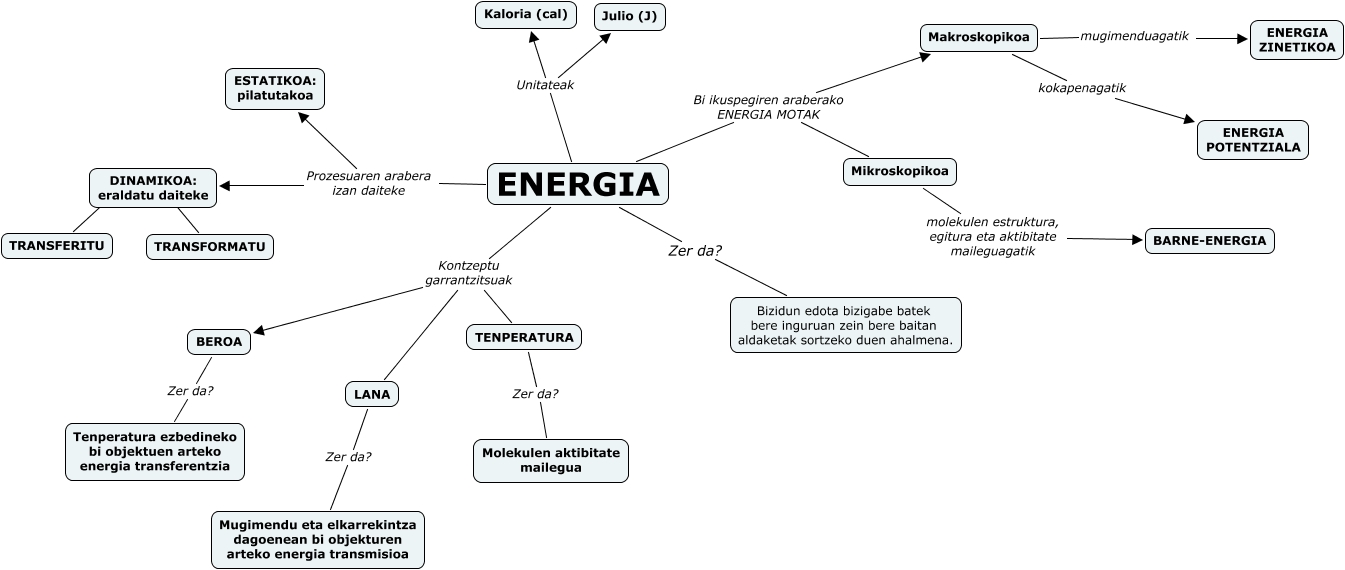 Este Cmap, tiene información relacionada con: Hezkuntza4, ENERGIA Unitateak Julio (J), ENERGIA Bi ikuspegiren araberako ENERGIA MOTAK Makroskopikoa, Makroskopikoa kokapenagatik ENERGIA POTENTZIALA, TENPERATURA Zer da? Molekulen aktibitate mailegua, ENERGIA Kontzeptu garrantzitsuak TENPERATURA, DINAMIKOA: eraldatu daiteke ???? TRANSFORMATU, ENERGIA Bi ikuspegiren araberako ENERGIA MOTAK Mikroskopikoa, ENERGIA Prozesuaren arabera izan daiteke DINAMIKOA: eraldatu daiteke, Mikroskopikoa molekulen estruktura, egitura eta aktibitate maileguagatik BARNE-ENERGIA, ENERGIA Prozesuaren arabera izan daiteke ESTATIKOA: pilatutakoa, ENERGIA Kontzeptu garrantzitsuak BEROA, LANA Zer da? Mugimendu eta elkarrekintza dagoenean bi objekturen arteko energia transmisioa, Makroskopikoa mugimenduagatik ENERGIA ZINETIKOA, BEROA Zer da? Tenperatura ezbedineko bi objektuen arteko energia transferentzia, DINAMIKOA: eraldatu daiteke ???? TRANSFERITU, ENERGIA Kontzeptu garrantzitsuak LANA, ENERGIA Unitateak Kaloria (cal), ENERGIA Zer da? Bizidun edota bizigabe batek bere inguruan zein bere baitan aldaketak sortzeko duen ahalmena.