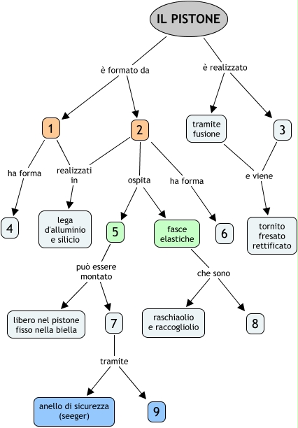 Questa Cmap, creata con IHMC CmapTools, contiene informazioni relative a: Pistone (Moodle), fasce elastiche che sono raschiaolio e raccogliolio, 3 e viene tornito fresato rettificato, IL PISTONE è formato da 1, 2 realizzati in lega d'alluminio e silicio, IL PISTONE è realizzato tramite fusione, IL PISTONE è realizzato 3, 7 tramite 9, 2 ha forma 6, IL PISTONE è formato da 2, 5 può essere montato libero nel pistone fisso nella biella, 5 può essere montato 7, 2 ospita 5, 7 tramite anello di sicurezza (seeger), 2 ospita fasce elastiche, tramite fusione e viene tornito fresato rettificato, 1 ha forma 4, 1 realizzati in lega d'alluminio e silicio, fasce elastiche che sono 8