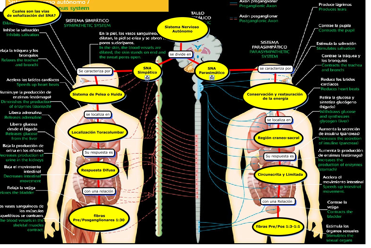 Este Cmap, tiene información relacionada con: SNA, Sistema de Pelea o Huida se localiza en Localización Toracolumbar, Conservación y restauración de la energía se localiza en Región craneo-sacral, Localización Toracolumbar Su respuesta es Respuesta Difusa, Región craneo-sacral Su respuesta es Circunscrita y Limitada, Sistema Nervioso Autónomo se divide en SNA Parasimático, SNA Parasimático se caracteriza por Conservación y restauración de la energía, Respuesta Difusa con una relación fibras Pre/Posganglionares 1:30, Sistema Nervioso Autónomo se divide en SNA Simpático, SNA Simpático Se caracteriza por Sistema de Pelea o Huida, Circunscrita y Limitada con una Relación fibras Pre/Pos 1:3-1:1