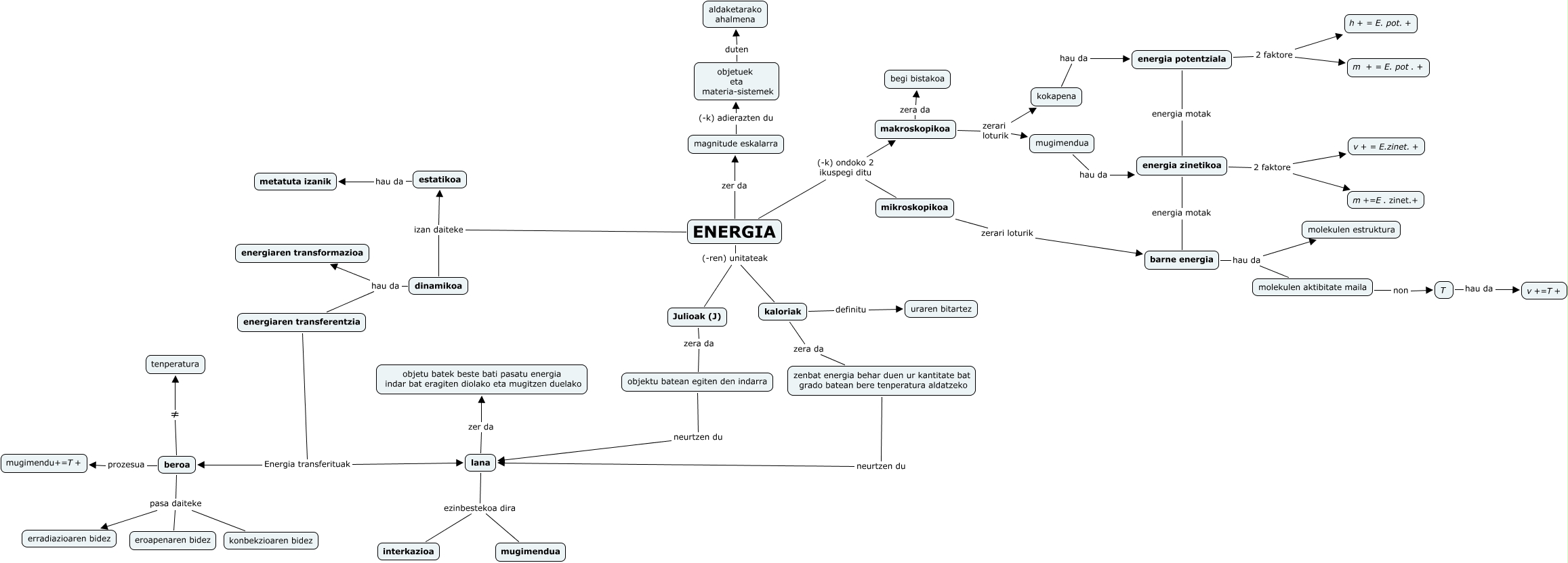 Este Cmap, tiene información relacionada con: Hezkuntza_52, makroskopikoa zerari loturik mugimendua, beroa ≠ tenperatura, energia zinetikoa 2 faktore m+=E. zinet.+, beroa prozesua mugimendu+=T+, ENERGIA (-ren) unitateak kaloriak, energia potentziala 2 faktore m + = E. pot. +, lana ezinbestekoa dira mugimendua, barne energia hau da molekulen estruktura, kaloriak definitu uraren bitartez, dinamikoa hau da energiaren transformazioa, energia potentziala energia motak energia zinetikoa, kokapena hau da energia potentziala, zenbat energia behar duen ur kantitate bat grado batean bere tenperatura aldatzeko neurtzen du lana, dinamikoa izan daiteke estatikoa, beroa pasa daiteke erradiazioaren bidez, energiaren transferentzia Energia transferituak beroa, objetuek eta materia-sistemek duten aldaketarako ahalmena, makroskopikoa zerari loturik kokapena, beroa pasa daiteke konbekzioaren bidez, barne energia hau da molekulen aktibitate maila