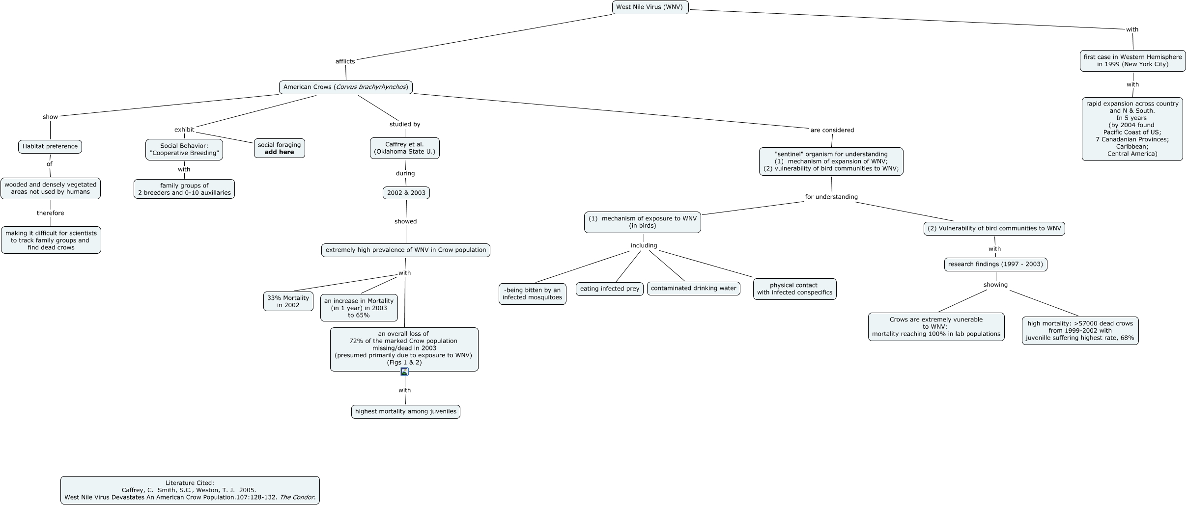 This Concept Map, created with IHMC CmapTools, has information related to: Crows and WNV, extremely high prevalence of WNV in Crow population with an overall loss of 72% of the marked Crow population missing/dead in 2003 (presumed primarily due to exposure to WNV) (Figs 1 & 2), West Nile Virus (WNV) afflicts American Crows (Corvus brachyrhynchos), (2) Vulnerability of bird communities to WNV with research findings (1997 - 2003), wooded and densely vegetated areas not used by humans therefore making it difficult for scientists to track family groups and find dead crows, research findings (1997 - 2003) showing high mortality: dead crows from 1999-2002 with juvenille suffering highest rate, 68%, (1) mechanism of exposure to WNV (in birds) including physical contact with infected conspecifics, Habitat preference of wooded and densely vegetated areas not used by humans, research findings (1997 - 2003) showing Crows are extremely vunerable to WNV: mortality reaching 100% in lab populations, "sentinel" organism for understanding (1) mechanism of expansion of WNV; (2) vulnerability of bird communities to WNV; for understanding (1) mechanism of exposure to WNV (in birds), (1) mechanism of exposure to WNV (in birds) including contaminated drinking water, American Crows (Corvus brachyrhynchos) show Habitat preference, an overall loss of 72% of the marked Crow population missing/dead in 2003 (presumed primarily due to exposure to WNV) (Figs 1 & 2) with highest mortality among juveniles, Caffrey et al. (Oklahoma State U.) during 2002 & 2003, "sentinel" organism for understanding (1) mechanism of expansion of WNV; (2) vulnerability of bird communities to WNV; for understanding (2) Vulnerability of bird communities to WNV, 2002 & 2003 showed extremely high prevalence of WNV in Crow population, American Crows (Corvus brachyrhynchos) exhibit Social Behavior: "Cooperative Breeding", extremely high prevalence of WNV in Crow population with 33% Mortality in 2002, (1) mechanism of exposure to WNV (in birds) including eating infected prey, West Nile Virus (WNV) with first case in Western Hemisphere in 1999 (New York City), (1) mechanism of exposure to WNV (in birds) including -being bitten by an infected mosquitoes