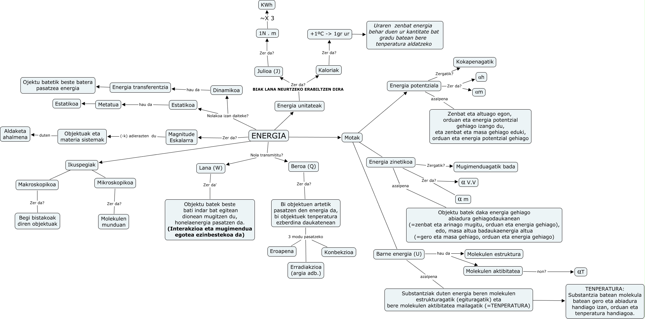 Este Cmap, tiene información relacionada con: Hezkuntza_6, Objektuak eta materia sistemak duten Aldaketa ahalmena, ENERGIA ???? Ikuspegiak, Energia zinetikoa azalpena Objektu batek daka energia gehiago abiadura gehiagodaukanean (=zenbat eta arinago mugitu, orduan eta energia gehiago), edo, masa altua badaukaenergia altua (=gero eta masa gehiago, orduan eta energia gehiago), Energia zinetikoa Zer da? α m, Barne energia (U) azalpena Substantziak duten energia beren molekulen estrukturagatik (egituragatik) eta bere molekulen aktibitatea mailagatik (=TENPERATURA), Beroa (Q) Zer da? Bi objektuen artetik pasatzen den energia da, bi objektuek tenperatura ezberdina daukatenean, Bi objektuen artetik pasatzen den energia da, bi objektuek tenperatura ezberdina daukatenean 3 modu pasatzeko Konbekzioa, Energia unitateak Zer da? BIAK LANA NEURTZEKO ERABILTZEN DIRA Julioa (J), Mikroskopikoa Zer da? Molekulen munduan, 1N . m ~X 3 KWh, Julioa (J) Zer da? 1N . m, ENERGIA Nola transmititu? Lana (W), Energia potentziala azalpena Zenbat eta altuago egon, orduan eta energia potentzial gehiago izango du, eta zenbat eta masa gehiago eduki, orduan eta energia potentzial gehiago, ENERGIA ???? Energia unitateak, ENERGIA Zer da? Magnitude Eskalarra, +1ºC -> 1gr ur ???? Uraren zenbat energia behar duen ur kantitate bat gradu batean bere tenperatura aldatzeko, Energia potentziala Zer da? αh, Energia zinetikoa Zer da? α V.V, Kaloriak Zer da? +1ºC -> 1gr ur, Bi objektuen artetik pasatzen den energia da, bi objektuek tenperatura ezberdina daukatenean 3 modu pasatzeko Eroapena