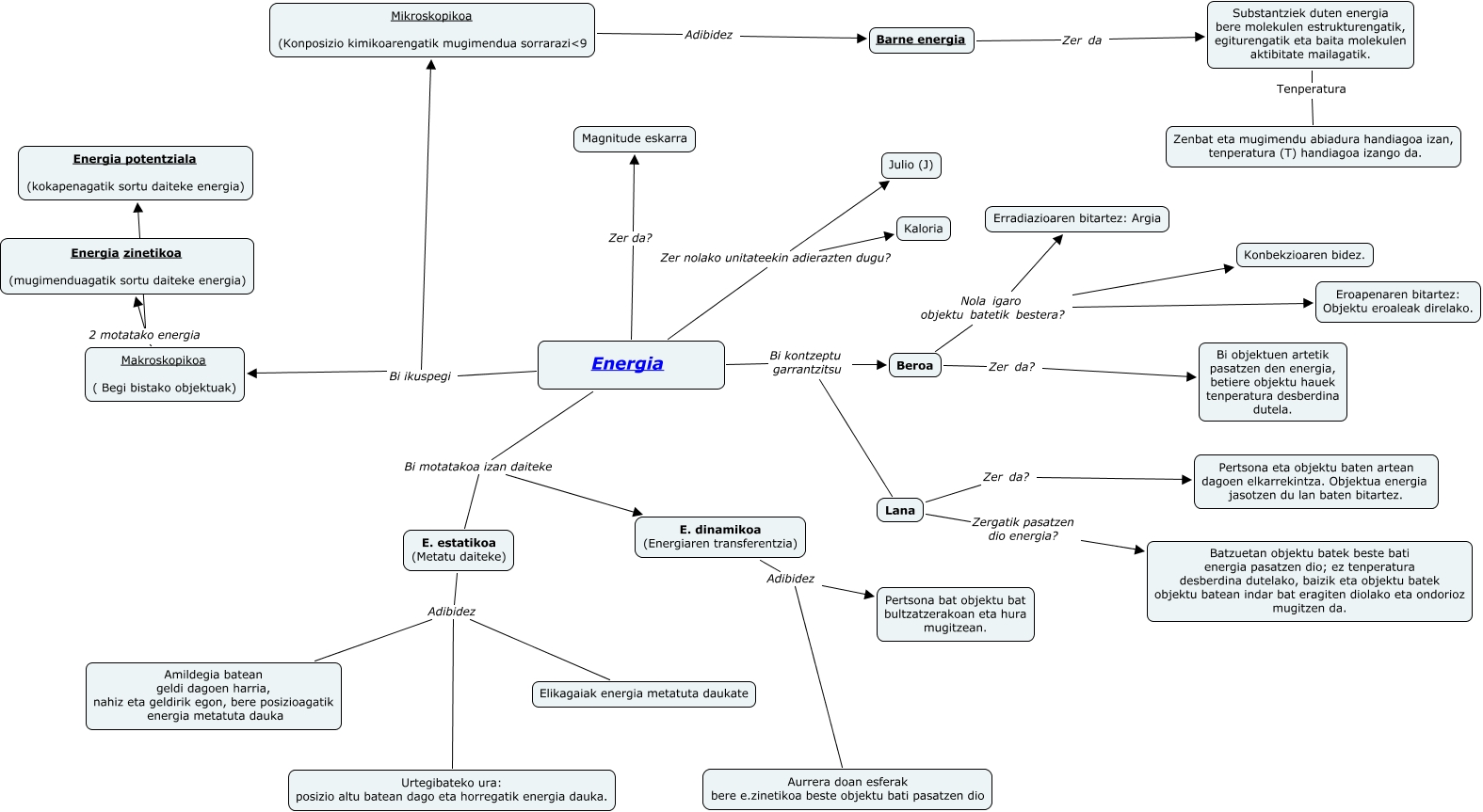 Este Cmap, tiene información relacionada con: Sin Título, Energia Bi motatakoa izan daiteke E. dinamikoa (Energiaren transferentzia), Beroa Nola igaro objektu batetik bestera? Erradiazioaren bitartez: Argia, Makroskopikoa ( Begi bistako objektuak) 2 motatako energia Energia potentziala (kokapenagatik sortu daiteke energia), Energia Bi kontzeptu garrantzitsu Beroa, E. estatikoa (Metatu daiteke) Adibidez Elikagaiak energia metatuta daukate, Energia Zer nolako unitateekin adierazten dugu? Julio (J), Energia Bi ikuspegi Mikroskopikoa (Konposizio kimikoarengatik mugimendua sorraraziɡ, Beroa Nola igaro objektu batetik bestera? Eroapenaren bitartez: Objektu eroaleak direlako., Energia Bi kontzeptu garrantzitsu Lana, Makroskopikoa ( Begi bistako objektuak) 2 motatako energia Energia zinetikoa (mugimenduagatik sortu daiteke energia), E. dinamikoa (Energiaren transferentzia) Adibidez Aurrera doan esferak bere e.zinetikoa beste objektu bati pasatzen dio, E. dinamikoa (Energiaren transferentzia) Adibidez Pertsona bat objektu bat bultzatzerakoan eta hura mugitzean., Substantziek duten energia bere molekulen estrukturengatik, egiturengatik eta baita molekulen aktibitate mailagatik. Tenperatura Zenbat eta mugimendu abiadura handiagoa izan, tenperatura (T) handiagoa izango da., E. estatikoa (Metatu daiteke) Adibidez Urtegibateko ura: posizio altu batean dago eta horregatik energia dauka., Beroa Nola igaro objektu batetik bestera? Konbekzioaren bidez., Energia Zer nolako unitateekin adierazten dugu? Kaloria, Energia Zer da? Magnitude eskarra, E. estatikoa (Metatu daiteke) Adibidez Amildegia batean geldi dagoen harria, nahiz eta geldirik egon, bere posizioagatik energia metatuta dauka, Lana Zergatik pasatzen dio energia? Batzuetan objektu batek beste bati energia pasatzen dio; ez tenperatura desberdina dutelako, baizik eta objektu batek objektu batean indar bat eragiten diolako eta ondorioz mugitzen da., Beroa Zer da? Bi objektuen artetik pasatzen den energia, betiere objektu hauek tenperatura desberdina dutela.