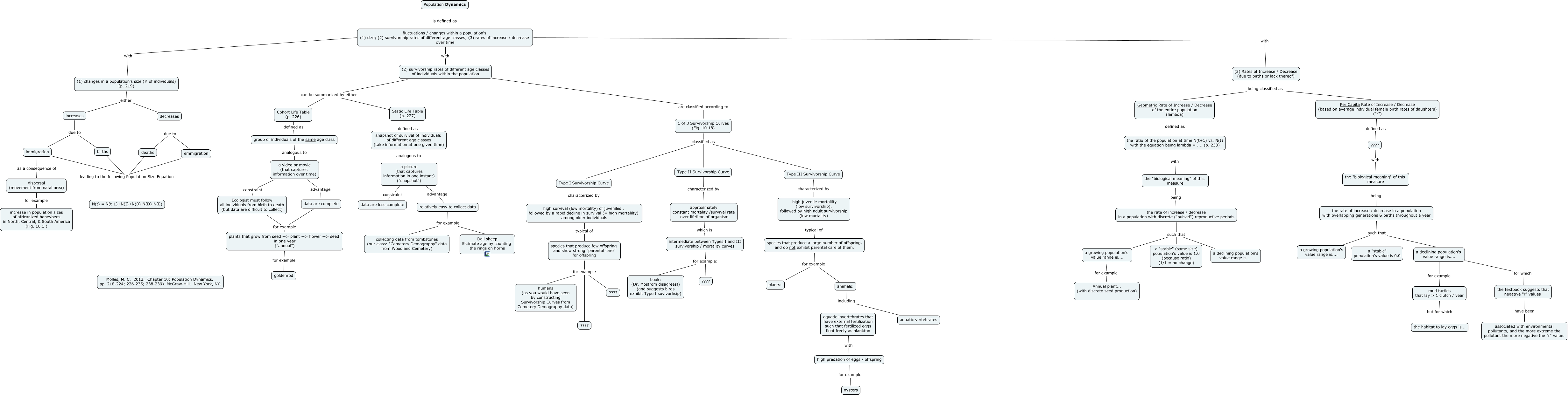 This Concept Map, created with IHMC CmapTools, has information related to: Pop Dynamics 021615afterclass, the textbook suggests that negative "r" values have been associated with environmental pollutants, and the more extreme the pollutant the more negative the "r" value., data are complete for example plants that grow from seed --> plant --> flower --> seed in one year ("annual"), animals: including aquatic vertebrates, the rate of increase / decrease in a population with overlapping generations & births throughout a year such that a declining population's value range is...., group of individuals of the same age class analogous to a video or movie (that captures information over time), decreases due to deaths, relatively easy to collect data for example Dall sheep Estimate age by counting the rings on horns, (1) changes in a population's size (# of individuals) (p. 219) either increases, (1) changes in a population's size (# of individuals) (p. 219) either decreases, the ratio of the population at time N(t+1) vs. N(t) with the equation being lambda = .... (p. 233) with the "biological meaning" of this measure, immigration leading to the following Population Size Equation N(t) = N(t-1)+N(I)+N(B)-N(D)-N(E), fluctuations / changes within a population's (1) size; (2) survivorship rates of different age classes; (3) rates of increase / decrease over time with (1) changes in a population's size (# of individuals) (p. 219), 1 of 3 Survivorship Curves (Fig. 10.18) classified as Type I Survivorship Curve, ???? with the "biological meaning" of this measure, species that produce a large number of offspring, and do not exhibit parental care of them. for example: plants:, dispersal (movement from natal area) for example increase in population sizes of africanized honeybees in North, Central, & South America (Fig. 10.1 ), plants that grow from seed --> plant --> flower --> seed in one year ("annual") for example goldenrod, species that produce few offspring and show strong "parental care" for offspring for example humans (as you would have seen by constructing Survivorship Curves from Cemetery Demography data), Type I Survivorship Curve characterized by high survival (low mortality) of juveniles , followed by a rapid decline in survival (= high mortalilty) among older individuals, immigration as a consequence of dispersal (movement from natal area)
