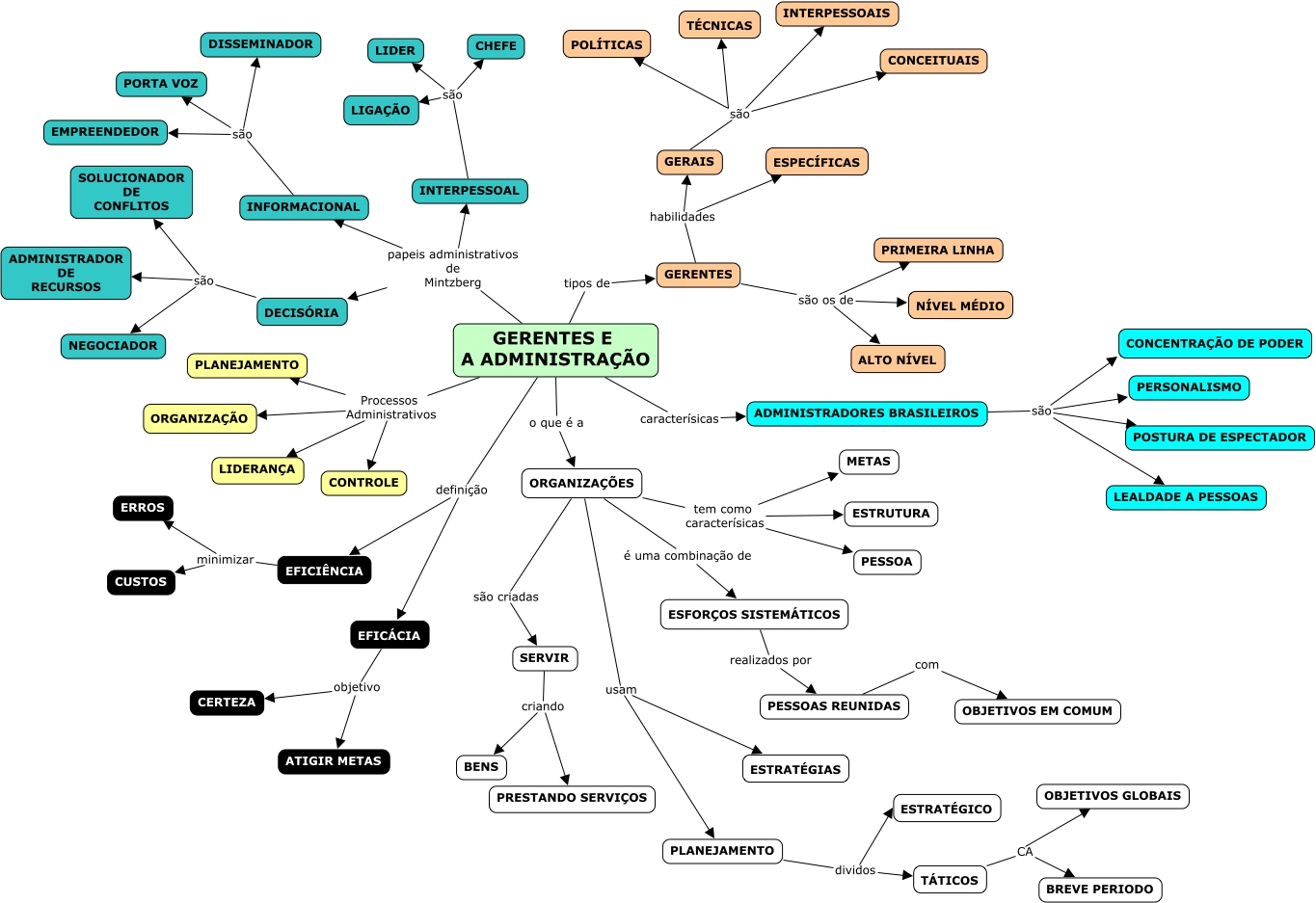 Esse mapa conceitual, produzido no IHMC CmapTools, tem a informação relacionada a: 01. 1a semana - gerentes e administracao, ADMINISTRADORES BRASILEIROS são PERSONALISMO, EFICÁCIA objetivo CERTEZA, INFORMACIONAL são EMPREENDEDOR, INFORMACIONAL são PORTA VOZ, INTERPESSOAL são LIGAÇÃO, GERENTES E A ADMINISTRAÇÃO Processos Administrativos PLANEJAMENTO, PLANEJAMENTO dividos ESTRATÉGICO, TÁTICOS CA OBJETIVOS GLOBAIS, GERENTES E A ADMINISTRAÇÃO definição EFICÁCIA, GERAIS são TÉCNICAS, ADMINISTRADORES BRASILEIROS são LEALDADE A PESSOAS, GERAIS são INTERPESSOAIS, INFORMACIONAL são DISSEMINADOR, ORGANIZAÇÕES são criadas SERVIR, EFICIÊNCIA minimizar ERROS, ORGANIZAÇÕES usam ESTRATÉGIAS, ADMINISTRADORES BRASILEIROS são CONCENTRAÇÃO DE PODER, SERVIR criando PRESTANDO SERVIÇOS, DECISÓRIA são ADMINISTRADOR DE RECURSOS, GERENTES E A ADMINISTRAÇÃO o que é a ORGANIZAÇÕES