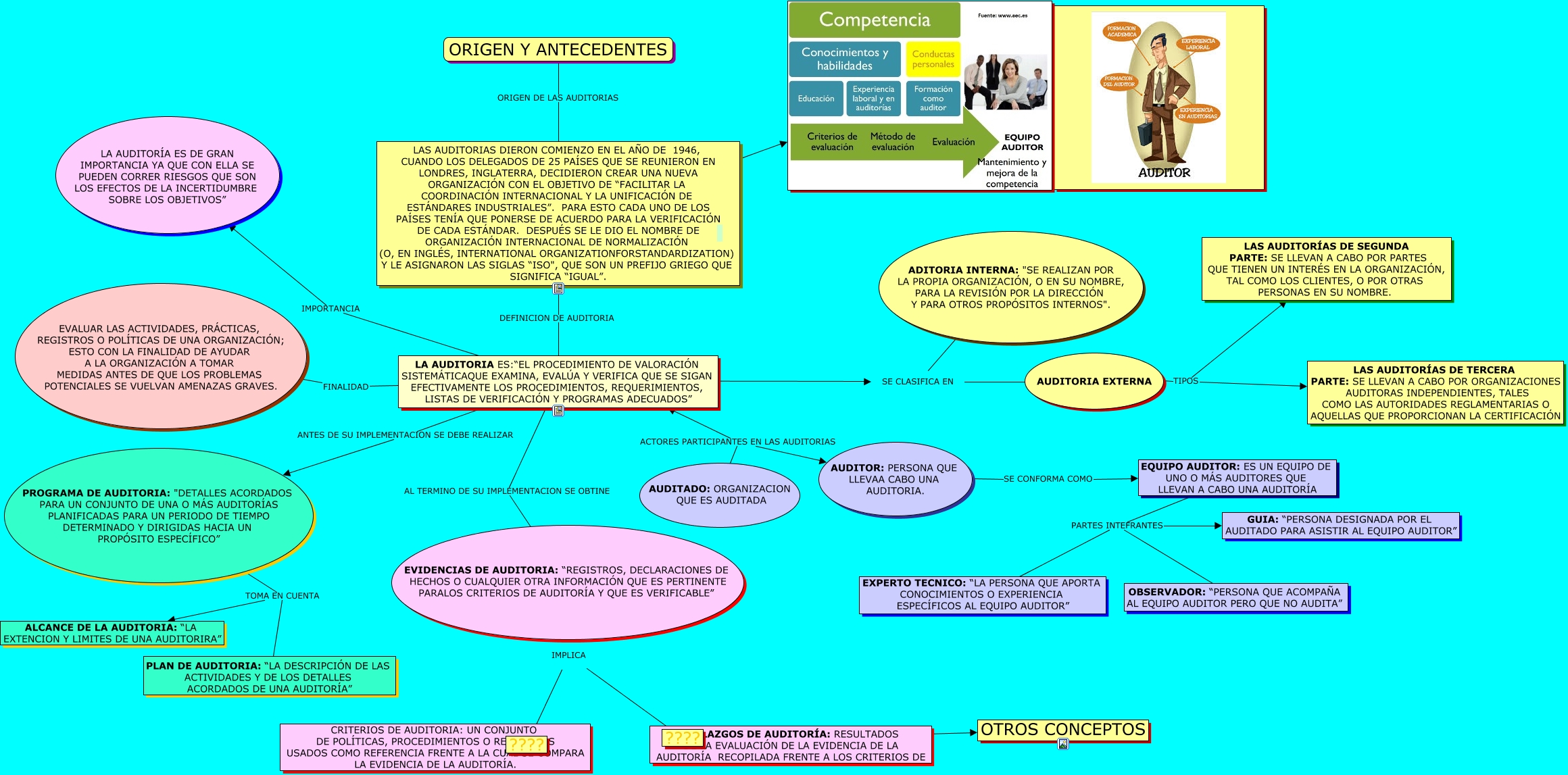 Este Cmap, tiene información relacionada con: ORIGENES Y ANTECEDENTES, PROGRAMA DE AUDITORIA: "DETALLES ACORDADOS PARA UN CONJUNTO DE UNA O MÁS AUDITORÍAS PLANIFICADAS PARA UN PERIODO DE TIEMPO DETERMINADO Y DIRIGIDAS HACIA UN PROPÓSITO ESPECÍFICO” TOMA EN CUENTA PLAN DE AUDITORIA: “LA DESCRIPCIÓN DE LAS ACTIVIDADES Y DE LOS DETALLES ACORDADOS DE UNA AUDITORÍA”, AUDITORIA EXTERNA TIPOS LAS AUDITORÍAS DE TERCERA PARTE: SE LLEVAN A CABO POR ORGANIZACIONES AUDITORAS INDEPENDIENTES, TALES COMO LAS AUTORIDADES REGLAMENTARIAS O AQUELLAS QUE PROPORCIONAN LA CERTIFICACIÓN, HALLAZGOS DE AUDITORÍA: RESULTADOS DE LA EVALUACIÓN DE LA EVIDENCIA DE LA AUDITORÍA RECOPILADA FRENTE A LOS CRITERIOS DE ???? OTROS CONCEPTOS, AUDITADO: ORGANIZACION QUE ES AUDITADA ACTORES PARTICIPANTES EN LAS AUDITORIAS AUDITOR: PERSONA QUE LLEVAA CABO UNA AUDITORIA., LA AUDITORIA ES:“EL PROCEDIMIENTO DE VALORACIÓN SISTEMÁTICAQUE EXAMINA, EVALÚA Y VERIFICA QUE SE SIGAN EFECTIVAMENTE LOS PROCEDIMIENTOS, REQUERIMIENTOS, LISTAS DE VERIFICACIÓN Y PROGRAMAS ADECUADOS” SE SE CLASIFICA EN, LA AUDITORIA ES:“EL PROCEDIMIENTO DE VALORACIÓN SISTEMÁTICAQUE EXAMINA, EVALÚA Y VERIFICA QUE SE SIGAN EFECTIVAMENTE LOS PROCEDIMIENTOS, REQUERIMIENTOS, LISTAS DE VERIFICACIÓN Y PROGRAMAS ADECUADOS” IMPORTANCIA LA AUDITORÍA ES DE GRAN IMPORTANCIA YA QUE CON ELLA SE PUEDEN CORRER RIESGOS QUE SON LOS EFECTOS DE LA INCERTIDUMBRE SOBRE LOS OBJETIVOS”, AUDITOR: PERSONA QUE LLEVAA CABO UNA AUDITORIA. SE CONFORMA COMO EQUIPO AUDITOR: ES UN EQUIPO DE UNO O MÁS AUDITORES QUE LLEVAN A CABO UNA AUDITORÍA, EQUIPO AUDITOR: ES UN EQUIPO DE UNO O MÁS AUDITORES QUE LLEVAN A CABO UNA AUDITORÍA PARTES INTEFRANTES GUIA: “PERSONA DESIGNADA POR EL AUDITADO PARA ASISTIR AL EQUIPO AUDITOR”, EQUIPO AUDITOR: ES UN EQUIPO DE UNO O MÁS AUDITORES QUE LLEVAN A CABO UNA AUDITORÍA PARTES INTEFRANTES OBSERVADOR: “PERSONA QUE ACOMPAÑA AL EQUIPO AUDITOR PERO QUE NO AUDITA”, SE CLASIFICA EN ???? AUDITORIA EXTERNA, LA AUDITORIA ES:“EL PROCEDIMIENTO DE VALORACIÓN SISTEMÁTICAQUE EXAMINA, EVALÚA Y VERIFICA QUE SE SIGAN EFECTIVAMENTE LOS PROCEDIMIENTOS, REQUERIMIENTOS, LISTAS DE VERIFICACIÓN Y PROGRAMAS ADECUADOS” AL TERMINO DE SU IMPLEMENTACION SE OBTINE EVIDENCIAS DE AUDITORIA: “REGISTROS, DECLARACIONES DE HECHOS O CUALQUIER OTRA INFORMACIÓN QUE ES PERTINENTE PARALOS CRITERIOS DE AUDITORÍA Y QUE ES VERIFICABLE”, ORIGEN Y ANTECEDENTES ORIGEN DE LAS AUDITORIAS LAS AUDITORIAS DIERON COMIENZO EN EL AÑO DE 1946, CUANDO LOS DELEGADOS DE 25 PAÍSES QUE SE REUNIERON EN LONDRES, INGLATERRA, DECIDIERON CREAR UNA NUEVA ORGANIZACIÓN CON EL OBJETIVO DE “FACILITAR LA COORDINACIÓN INTERNACIONAL Y LA UNIFICACIÓN DE ESTÁNDARES INDUSTRIALES”. PARA ESTO CADA UNO DE LOS PAÍSES TENÍA QUE PONERSE DE ACUERDO PARA LA VERIFICACIÓN DE CADA ESTÁNDAR. DESPUÉS SE LE DIO EL NOMBRE DE ORGANIZACIÓN INTERNACIONAL DE NORMALIZACIÓN (O, EN INGLÉS, INTERNATIONAL ORGANIZATIONFORSTANDARDIZATION) Y LE ASIGNARON LAS SIGLAS “ISO", QUE SON UN PREFIJO GRIEGO QUE SIGNIFICA “IGUAL”., LAS AUDITORIAS DIERON COMIENZO EN EL AÑO DE 1946, CUANDO LOS DELEGADOS DE 25 PAÍSES QUE SE REUNIERON EN LONDRES, INGLATERRA, DECIDIERON CREAR UNA NUEVA ORGANIZACIÓN CON EL OBJETIVO DE “FACILITAR LA COORDINACIÓN INTERNACIONAL Y LA UNIFICACIÓN DE ESTÁNDARES INDUSTRIALES”. PARA ESTO CADA UNO DE LOS PAÍSES TENÍA QUE PONERSE DE ACUERDO PARA LA VERIFICACIÓN DE CADA ESTÁNDAR. DESPUÉS SE LE DIO EL NOMBRE DE ORGANIZACIÓN INTERNACIONAL DE NORMALIZACIÓN (O, EN INGLÉS, INTERNATIONAL ORGANIZATIONFORSTANDARDIZATION) Y LE ASIGNARON LAS SIGLAS “ISO", QUE SON UN PREFIJO GRIEGO QUE SIGNIFICA “IGUAL”. DEFINICION DE AUDITORIA LA AUDITORIA ES:“EL PROCEDIMIENTO DE VALORACIÓN SISTEMÁTICAQUE EXAMINA, EVALÚA Y VERIFICA QUE SE SIGAN EFECTIVAMENTE LOS PROCEDIMIENTOS, REQUERIMIENTOS, LISTAS DE VERIFICACIÓN Y PROGRAMAS ADECUADOS”, LAS AUDITORIAS DIERON COMIENZO EN EL AÑO DE 1946, CUANDO LOS DELEGADOS DE 25 PAÍSES QUE SE REUNIERON EN LONDRES, INGLATERRA, DECIDIERON CREAR UNA NUEVA ORGANIZACIÓN CON EL OBJETIVO DE “FACILITAR LA COORDINACIÓN INTERNACIONAL Y LA UNIFICACIÓN DE ESTÁNDARES INDUSTRIALES”. PARA ESTO CADA UNO DE LOS PAÍSES TENÍA QUE PONERSE DE ACUERDO PARA LA VERIFICACIÓN DE CADA ESTÁNDAR. DESPUÉS SE LE DIO EL NOMBRE DE ORGANIZACIÓN INTERNACIONAL DE NORMALIZACIÓN (O, EN INGLÉS, INTERNATIONAL ORGANIZATIONFORSTANDARDIZATION) Y LE ASIGNARON LAS SIGLAS “ISO", QUE SON UN PREFIJO GRIEGO QUE SIGNIFICA “IGUAL”. ????, EQUIPO AUDITOR: ES UN EQUIPO DE UNO O MÁS AUDITORES QUE LLEVAN A CABO UNA AUDITORÍA PARTES INTEFRANTES EXPERTO TECNICO: “LA PERSONA QUE APORTA CONOCIMIENTOS O EXPERIENCIA ESPECÍFICOS AL EQUIPO AUDITOR”, LAS AUDITORIAS DIERON COMIENZO EN EL AÑO DE 1946, CUANDO LOS DELEGADOS DE 25 PAÍSES QUE SE REUNIERON EN LONDRES, INGLATERRA, DECIDIERON CREAR UNA NUEVA ORGANIZACIÓN CON EL OBJETIVO DE “FACILITAR LA COORDINACIÓN INTERNACIONAL Y LA UNIFICACIÓN DE ESTÁNDARES INDUSTRIALES”. PARA ESTO CADA UNO DE LOS PAÍSES TENÍA QUE PONERSE DE ACUERDO PARA LA VERIFICACIÓN DE CADA ESTÁNDAR. DESPUÉS SE LE DIO EL NOMBRE DE ORGANIZACIÓN INTERNACIONAL DE NORMALIZACIÓN (O, EN INGLÉS, INTERNATIONAL ORGANIZATIONFORSTANDARDIZATION) Y LE ASIGNARON LAS SIGLAS “ISO", QUE SON UN PREFIJO GRIEGO QUE SIGNIFICA “IGUAL”. ????, LA AUDITORIA ES:“EL PROCEDIMIENTO DE VALORACIÓN SISTEMÁTICAQUE EXAMINA, EVALÚA Y VERIFICA QUE SE SIGAN EFECTIVAMENTE LOS PROCEDIMIENTOS, REQUERIMIENTOS, LISTAS DE VERIFICACIÓN Y PROGRAMAS ADECUADOS” ANTES DE SU IMPLEMENTACION SE DEBE REALIZAR PROGRAMA DE AUDITORIA: "DETALLES ACORDADOS PARA UN CONJUNTO DE UNA O MÁS AUDITORÍAS PLANIFICADAS PARA UN PERIODO DE TIEMPO DETERMINADO Y DIRIGIDAS HACIA UN PROPÓSITO ESPECÍFICO”, EVALUAR LAS ACTIVIDADES, PRÁCTICAS, REGISTROS O POLÍTICAS DE UNA ORGANIZACIÓN; ESTO CON LA FINALIDAD DE AYUDAR A LA ORGANIZACIÓN A TOMAR MEDIDAS ANTES DE QUE LOS PROBLEMAS POTENC