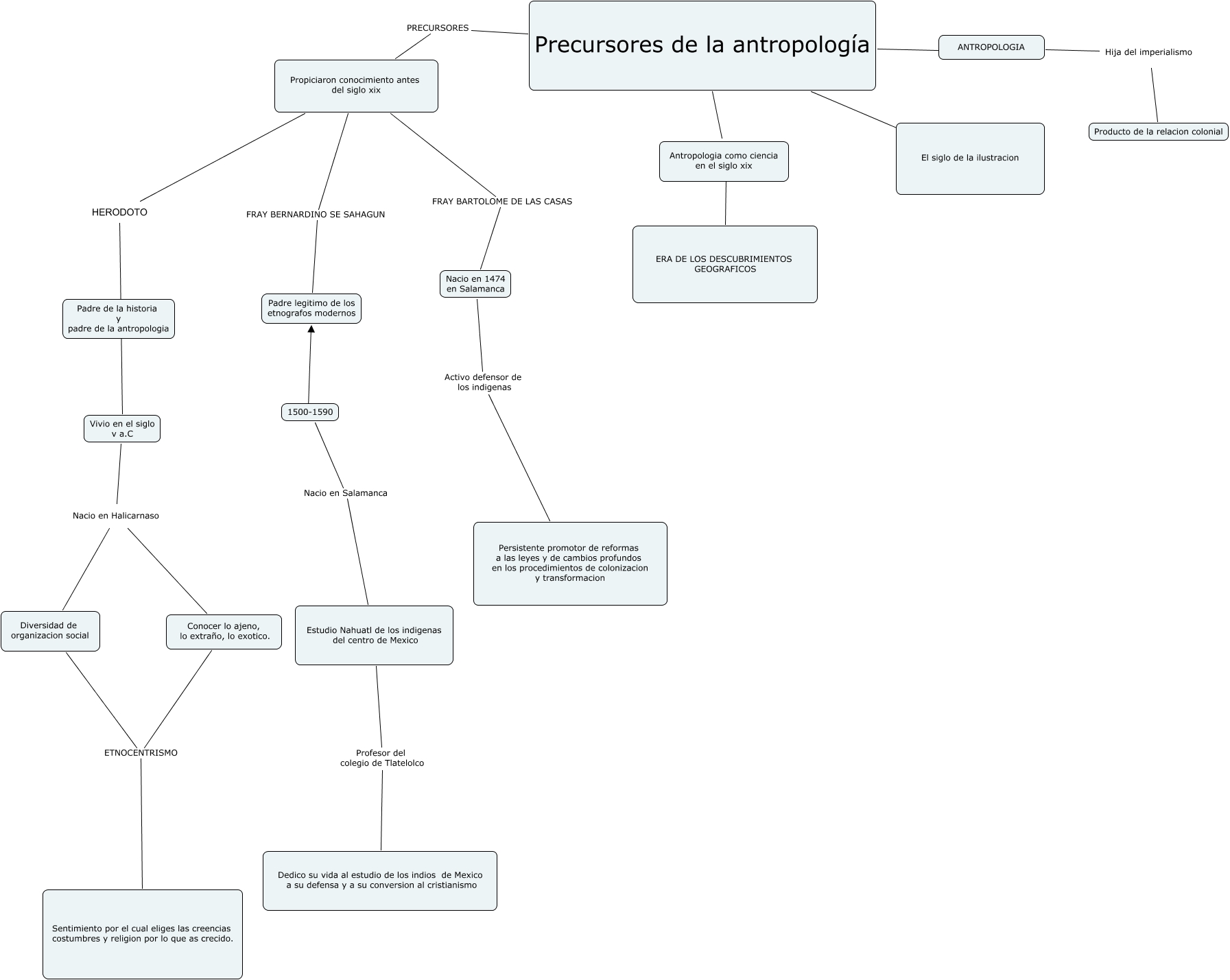 Este Cmap, tiene información relacionada con: precursores, Propiciaron conocimiento antes del siglo xix HERODOTO Vivio en el siglo v a.C, Vivio en el siglo v a.C Nacio en Halicarnaso Conocer lo ajeno, lo extraño, lo exotico., Conocer lo ajeno, lo extraño, lo exotico. ETNOCENTRISMO Sentimiento por el cual eliges las creencias costumbres y religion por lo que as crecido., 1500-1590 Nacio en Salamanca Estudio Nahuatl de los indigenas del centro de Mexico, Propiciaron conocimiento antes del siglo xix FRAY BARTOLOME DE LAS CASAS Nacio en 1474 en Salamanca, Precursores de la antropología ???? El siglo de la ilustracion, Estudio Nahuatl de los indigenas del centro de Mexico Profesor del colegio de Tlatelolco Dedico su vida al estudio de los indios de Mexico a su defensa y a su conversion al cristianismo, Diversidad de organizacion social ETNOCENTRISMO Sentimiento por el cual eliges las creencias costumbres y religion por lo que as crecido., 1500-1590 ???? Padre legitimo de los etnografos modernos, Precursores de la antropología ???? ANTROPOLOGIA, Nacio en 1474 en Salamanca Activo defensor de los indigenas Persistente promotor de reformas a las leyes y de cambios profundos en los procedimientos de colonizacion y transformacion, Propiciaron conocimiento antes del siglo xix FRAY BERNARDINO SE SAHAGUN Padre legitimo de los etnografos modernos, ANTROPOLOGIA Hija del imperialismo Producto de la relacion colonial, Precursores de la antropología ???? ERA DE LOS DESCUBRIMIENTOS GEOGRAFICOS, Precursores de la antropología PRECURSORES Propiciaron conocimiento antes del siglo xix, Vivio en el siglo v a.C Nacio en Halicarnaso Diversidad de organizacion social