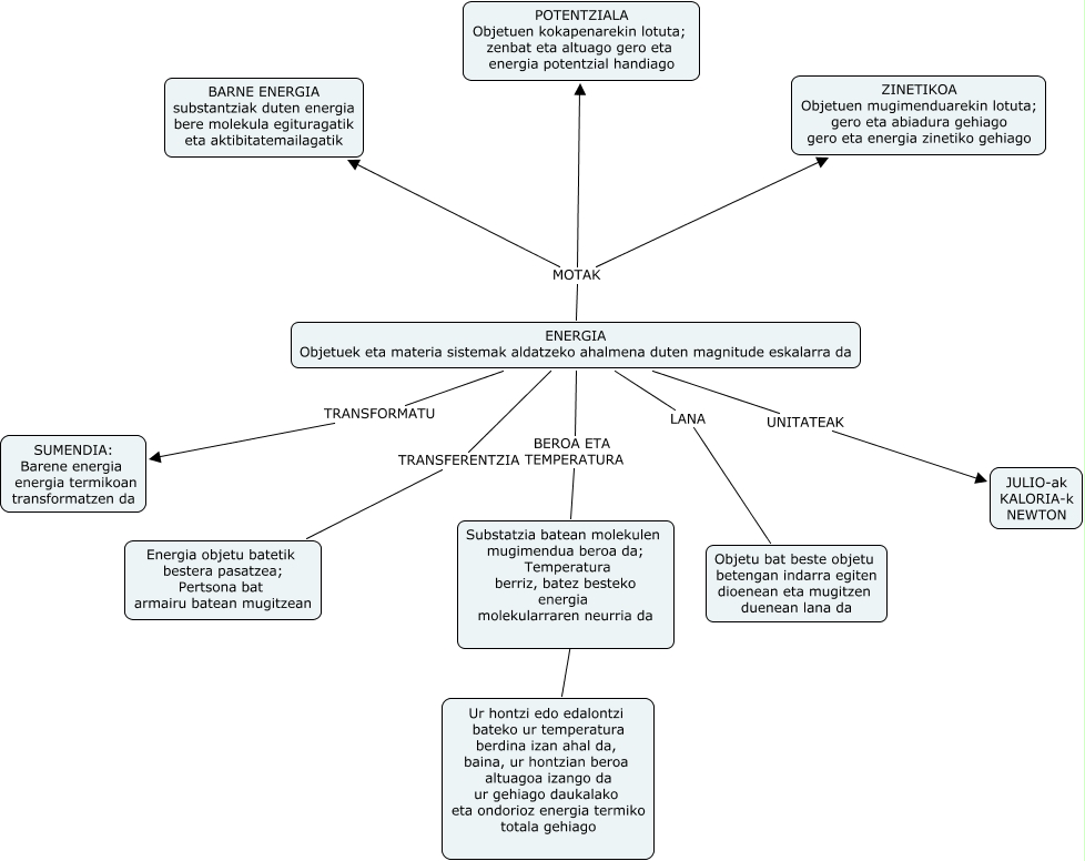 Este Cmap, tiene información relacionada con: hezkuntza_131, ENERGIA Objetuek eta materia sistemak aldatzeko ahalmena duten magnitude eskalarra da LANA Objetu bat beste objetu betengan indarra egiten dioenean eta mugitzen duenean lana da, ENERGIA Objetuek eta materia sistemak aldatzeko ahalmena duten magnitude eskalarra da MOTAK BARNE ENERGIA substantziak duten energia bere molekula egituragatik eta aktibitatemailagatik, ENERGIA Objetuek eta materia sistemak aldatzeko ahalmena duten magnitude eskalarra da MOTAK POTENTZIALA Objetuen kokapenarekin lotuta; zenbat eta altuago gero eta energia potentzial handiago, ENERGIA Objetuek eta materia sistemak aldatzeko ahalmena duten magnitude eskalarra da UNITATEAK JULIO-ak KALORIA-k NEWTON, ENERGIA Objetuek eta materia sistemak aldatzeko ahalmena duten magnitude eskalarra da MOTAK ZINETIKOA Objetuen mugimenduarekin lotuta; gero eta abiadura gehiago gero eta energia zinetiko gehiago, ENERGIA Objetuek eta materia sistemak aldatzeko ahalmena duten magnitude eskalarra da BEROA ETA TEMPERATURA Substatzia batean molekulen mugimendua beroa da; Temperatura berriz, batez besteko energia molekularraren neurria da, Substatzia batean molekulen mugimendua beroa da; Temperatura berriz, batez besteko energia molekularraren neurria da ???? Ur hontzi edo edalontzi bateko ur temperatura berdina izan ahal da, baina, ur hontzian beroa altuagoa izango da ur gehiago daukalako eta ondorioz energia termiko totala gehiago, ENERGIA Objetuek eta materia sistemak aldatzeko ahalmena duten magnitude eskalarra da TRANSFERENTZIA Energia objetu batetik bestera pasatzea; Pertsona bat armairu batean mugitzean, ENERGIA Objetuek eta materia sistemak aldatzeko ahalmena duten magnitude eskalarra da TRANSFORMATU SUMENDIA: Barene energia energia termikoan transformatzen da