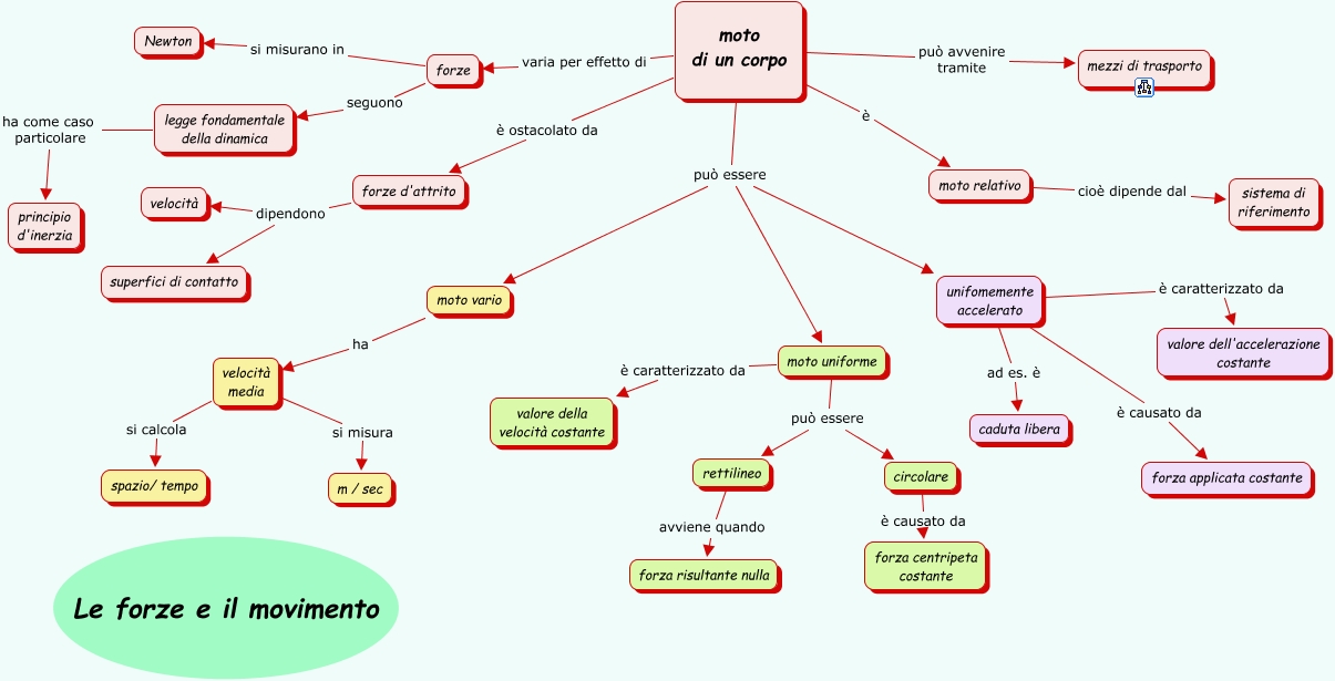 Questa Cmap, creata con IHMC CmapTools, contiene informazioni relative a: Le forze e il movimento, moto di un corpo può essere moto uniforme, unifomemente accelerato ad es. è caduta libera, moto uniforme può essere circolare, moto di un corpo può essere unifomemente accelerato, circolare è causato da forza centripeta costante, moto uniforme può essere rettilineo, unifomemente accelerato è causato da forza applicata costante, rettilineo avviene quando forza risultante nulla, moto di un corpo può essere moto vario, moto uniforme è caratterizzato da valore della velocità costante, moto di un corpo può avvenire tramite mezzi di trasporto, forze d'attrito dipendono superfici di contatto, moto relativo cioè dipende dal sistema di riferimento, forze d'attrito dipendono velocità, moto di un corpo è moto relativo, moto vario ha velocità media, velocità media si calcola spazio/ tempo, velocità media si misura m / sec, moto di un corpo varia per effetto di forze, forze seguono legge fondamentale della dinamica