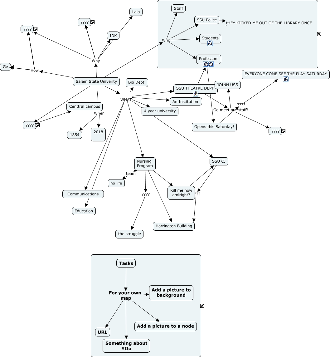 This Concept Map, created with IHMC CmapTools, has information related to: Copy of SSU_word_web, Opens this Saturday! ???? EVERYONE COME SEE THE PLAY SATURDAY, SSU CJ ???? Harrington Building, ???? ???? Im so sorry omg, Salem State Univerity Who Students, Ashley Preston! Bill Cunningham Celena Sky April, Salem State Univerity Why why not..., Salem, Massachusetts, USA ????, Salem State Univerity Why for education - & to drain your pockets, Salem State Univerity How blood, sweat, and tears, SSU THEATRE DEPT Go meet our staff! JOINN USS, Nursing Program ???? the struggle, Salem State Univerity Where North Campus, Salem State Univerity How Bank of mom and dad, Salem State Univerity How Financial Aid..., Salem State Univerity When 1854, SSU THEATRE DEPT ???? Opens this Saturday!, Salem State Univerity WHAT Education, Salem State Univerity WHAT SSU THEATRE DEPT, Salem State Univerity Who Staff, Salem State Univerity Where Centtral campus