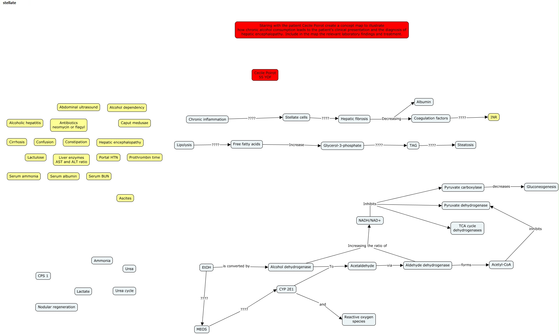 This Concept Map, created with IHMC CmapTools, has information related to: week 30 cecile poirot2a, MEOS ???? CYP 2E1, Chronic inflammation ???? Stellate cells, Glycerol-3-phosphate ???? TAG, Lipolysis ???? Free fatty acids, Aldehyde dehydrogenase forms Acetyl-CoA, Coagulation factors ???? INR, Acetaldehyde via Aldehyde dehydrogenase, NADH/NAD+ Inhibits TCA cycle dehydrogenases, EtOH ???? MEOS, Hepatic fibrosis Decreasing Coagulation factors, Alcohol dehydrogenase To Acetaldehyde, NADH/NAD+ Inhibits Pyruvate carboxylase, Acetyl-CoA inhibits Pyruvate dehydrogenase, TAG ???? Steatosis, Stellate cells ???? Hepatic fibrosis, Pyruvate carboxylase decreases Gluconeogenesis, NADH/NAD+ Inhibits Pyruvate dehydrogenase, CYP 2E1 and Reactive oxygen species, Aldehyde dehydrogenase Increasing the ratio of NADH/NAD+, EtOH is converted by Alcohol dehydrogenase