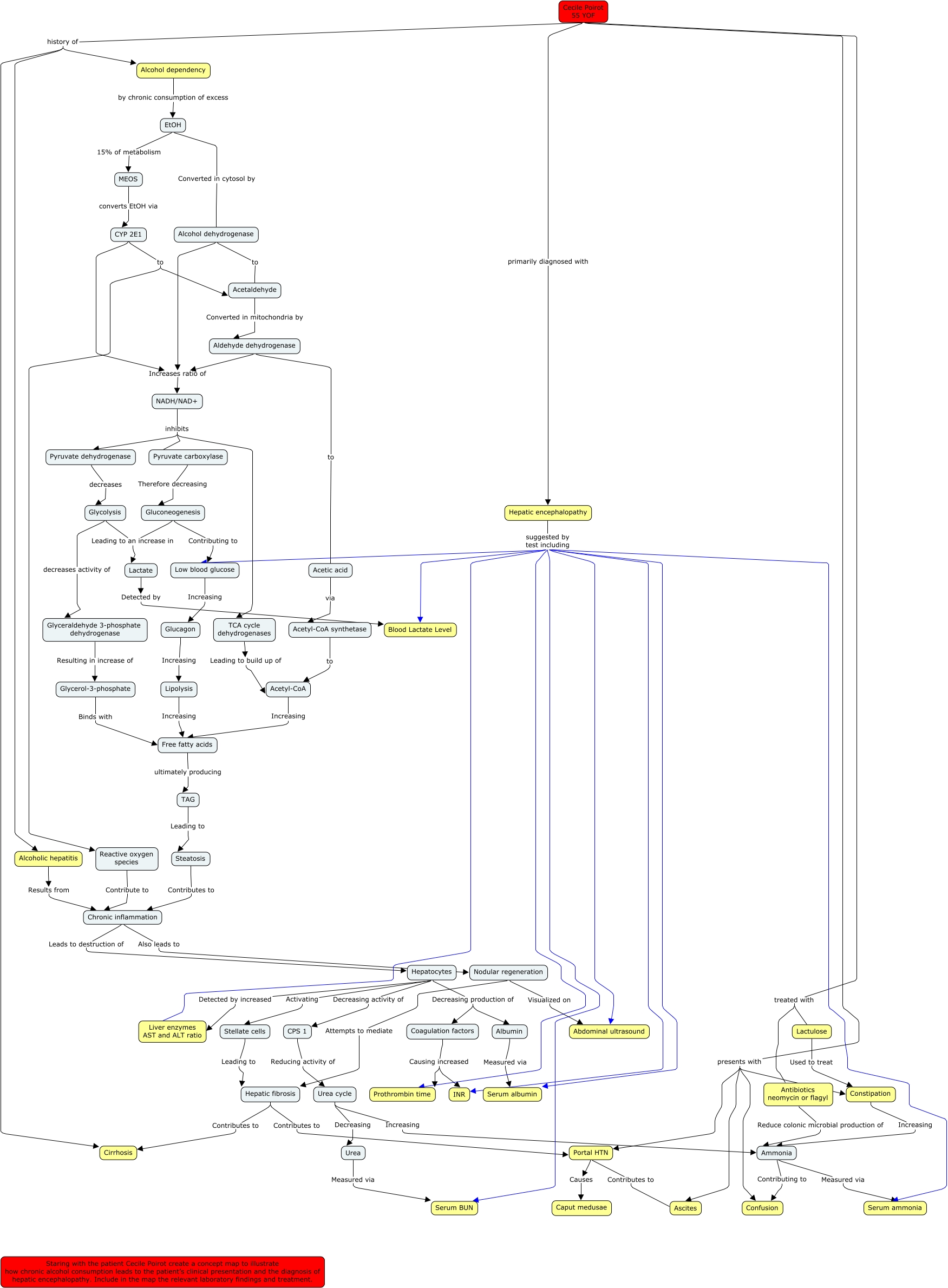 This Concept Map, created with IHMC CmapTools, has information related to: week 30, Cecile Poirot 55 YOF presents with Portal HTN, Portal HTN Contributes to Ascites, NADH/NAD+ inhibits Pyruvate dehydrogenase, Acetic acid via Acetyl-CoA synthetase, Low blood glucose Increasing Glucagon, NADH/NAD+ inhibits Pyruvate carboxylase, Alcohol dehydrogenase to Acetaldehyde, Lactulose Used to treat Constipation, Cecile Poirot 55 YOF presents with Constipation, Alcohol dehydrogenase Increases ratio of NADH/NAD+, Acetyl-CoA synthetase to Acetyl-CoA, Gluconeogenesis Contributing to Low blood glucose, Hepatic encephalopathy suggested by test including Prothrombin time, Urea cycle Decreasing Urea, Gluconeogenesis Leading to an increase in Lactate, CPS 1 Reducing activity of Urea cycle, Cecile Poirot 55 YOF treated with Antibiotics neomycin or flagyl, Hepatocytes Decreasing activity of CPS 1, Cecile Poirot 55 YOF presents with Ascites, Glycerol-3-phosphate Binds with Free fatty acids