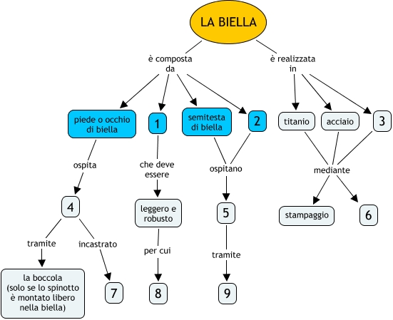 Questa Cmap, creata con IHMC CmapTools, contiene informazioni relative a: Biella (Moodle), 4 tramite la boccola (solo se lo spinotto è montato libero nella biella), LA BIELLA è realizzata in titanio, LA BIELLA è composta da 2, LA BIELLA è realizzata in acciaio, LA BIELLA è realizzata in 3, LA BIELLA è composta da 1, 1 che deve essere leggero e robusto, titanio mediante stampaggio, 3 mediante 6, 4 incastrato 7, 2 ospitano 5, acciaio mediante 6, semitesta di biella ospitano 5, 3 mediante stampaggio, titanio mediante 6, piede o occhio di biella ospita 4, 5 tramite 9, acciaio mediante stampaggio, LA BIELLA è composta da piede o occhio di biella, LA BIELLA è composta da semitesta di biella