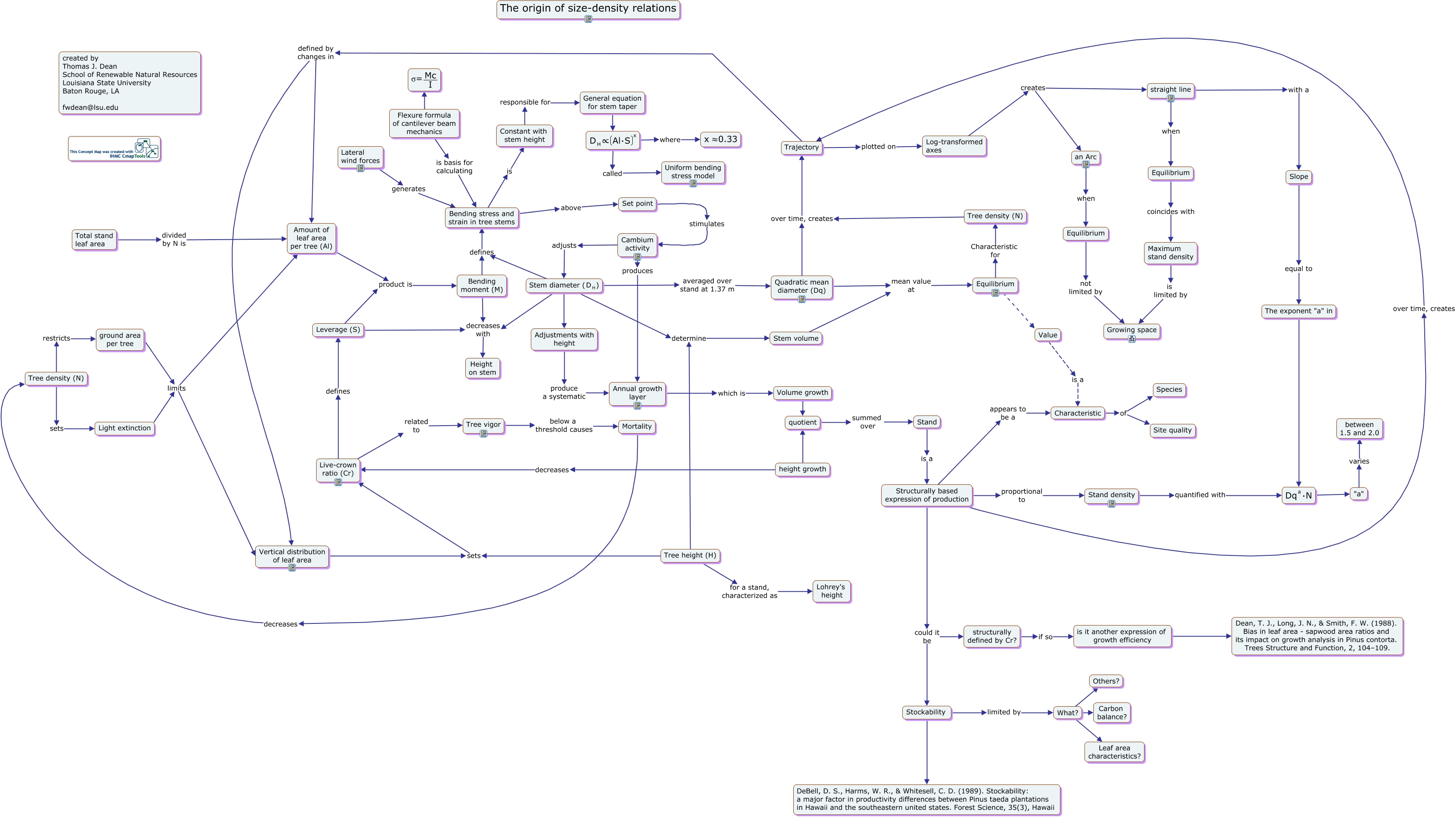 This Concept Map, created with IHMC CmapTools, has information related to: Size-density relations - testing version - Part IV, Equilibrium Characteristic for Tree density (N), <math xmlns="http://www.w3.org/1998/Math/MathML"> <mrow> <mtext> Stem diameter ( </mtext> <mmultiscripts> <mtext> D </mtext> <mtext> H </mtext> <none/> </mmultiscripts> <mtext> ) </mtext> </mrow> </math> averaged over stand at 1.37 m Quadratic mean diameter (Dq), <math xmlns="http://www.w3.org/1998/Math/MathML"> <mrow> <mmultiscripts> <mtext> D </mtext> <mtext> H </mtext> <none/> </mmultiscripts> <mtext> ∝ </mtext> <mmultiscripts> <mfenced open="(" close=")"> <mtext> Al⋅S </mtext> </mfenced> <none/> <mtext> x </mtext> </mmultiscripts> </mrow> </math> where x ≈0.33, Structurally based expression of production over time, creates Trajectory, height growth quotient, Bending stress and strain in tree stems is Constant with stem height, Amount of leaf area per tree (Al) product is Bending moment (M), Tree density (N) over time, creates Trajectory, <math xmlns="http://www.w3.org/1998/Math/MathML"> <mrow> <mtext> Flexure formula