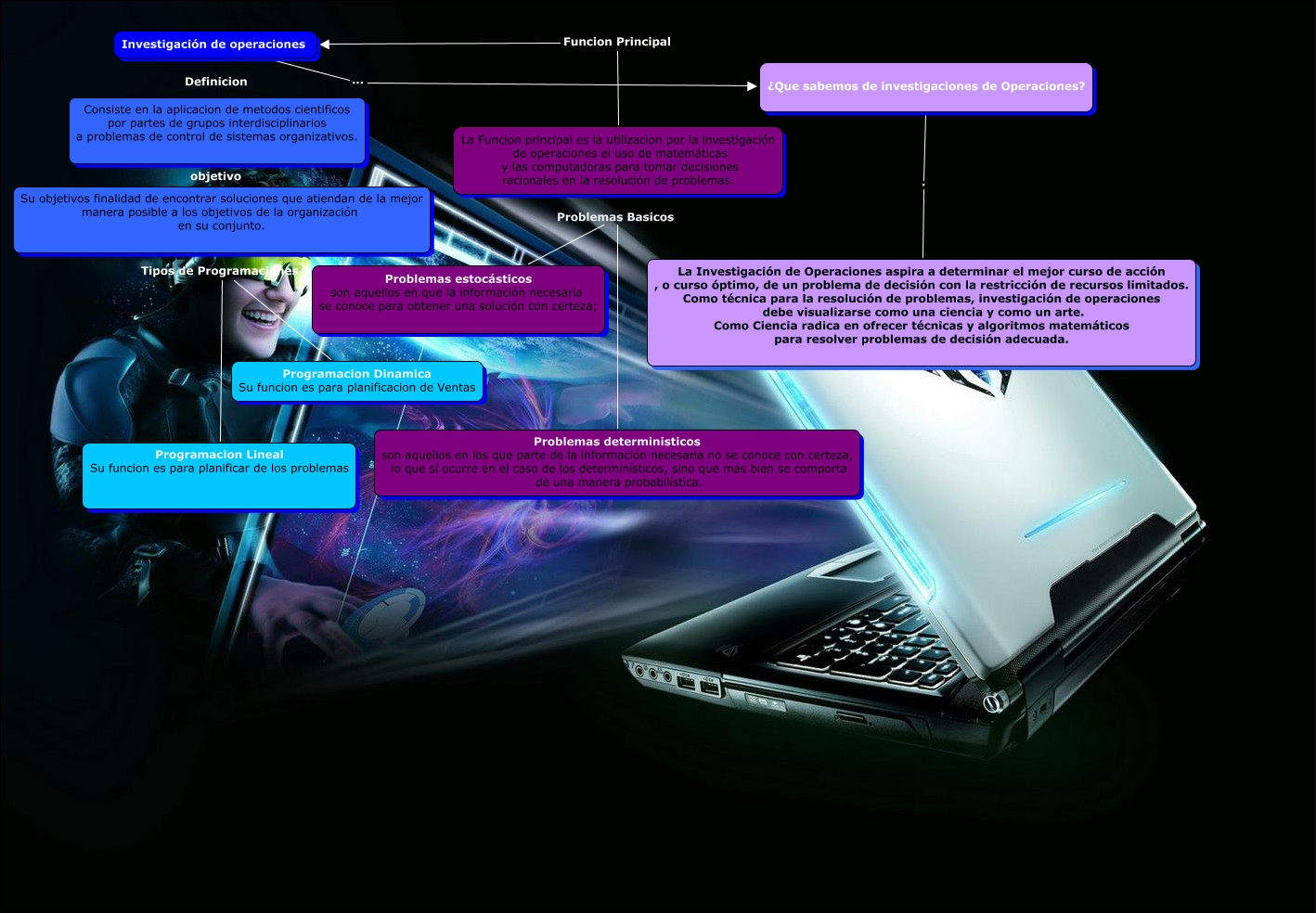 Este Cmap, tiene información relacionada con: Investigacion de Operaciones, Su objetivos finalidad de encontrar soluciones que atiendan de la mejor manera posible a los objetivos de la organización en su conjunto. objetivo Consiste en la aplicacion de metodos cientificos por partes de grupos interdisciplinarios a problemas de control de sistemas organizativos., Problemas deterministicos son aquellos en los que parte de la información necesaria no se conoce con certeza, lo que sí ocurre en el caso de los determinísticos, sino que más bien se comporta de una manera probabilística. Problemas Basicos La Funcion principal es la utilizacion por la investigación de operaciones el uso de matemáticas y las computadoras para tomar decisiones racionales en la resolución de problemas., Programacion Lineal Su funcion es para planificar de los problemas Tipos de Programaciones Programacion Dinamica Su funcion es para planificacion de Ventas, La Funcion principal es la utilizacion por la investigación de operaciones el uso de matemáticas y las computadoras para tomar decisiones racionales en la resolución de problemas. Funcion Principal Investigación de operaciones, Investigación de operaciones Definicion Consiste en la aplicacion de metodos cientificos por partes de grupos interdisciplinarios a problemas de control de sistemas organizativos., ¿Que sabemos de investigaciones de Operaciones? . La Investigación de Operaciones aspira a determinar el mejor curso de acción , o curso óptimo, de un problema de decisión con la restricción de recursos limitados. Como técnica para la resolución de problemas, investigación de operaciones debe visualizarse como una ciencia y como un arte. Como Ciencia radica en ofrecer técnicas y algoritmos matemáticos para resolver problemas de decisión adecuada., Investigación de operaciones ... ¿Que sabemos de investigaciones de Operaciones?, Problemas deterministicos son aquellos en los que parte de la información necesaria no se conoce con certeza, lo que sí ocurre en el caso de los determinísticos, sino que más bien se comporta de una manera probabilística. Problemas Basicos Problemas estocásticos son aquellos en que la información necesaria se conoce para obtener una solución con certeza;