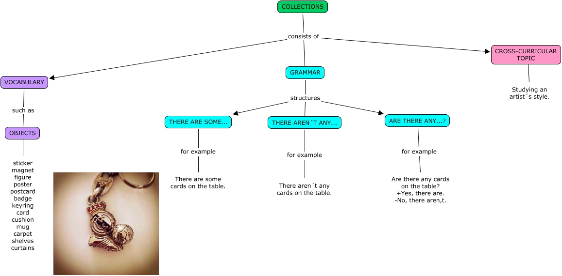 Este Cmap, tiene información relacionada con: COLLECTIONS-Lola, CROSS-CURRICULAR TOPIC ???? Studying an artist´s style., THERE ARE SOME... for example There are some cards on the table., GRAMMAR structures THERE ARE SOME..., COLLECTIONS consists of GRAMMAR, ARE THERE ANY...? for example Are there any cards on the table? +Yes, there are. -No, there aren,t., GRAMMAR structures ARE THERE ANY...?, OBJECTS ???? sticker magnet figure poster postcard badge keyring card cushion mug carpet shelves curtains, GRAMMAR structures THERE AREN´T ANY..., THERE AREN´T ANY... for example There aren´t any cards on the table., VOCABULARY such as OBJECTS, COLLECTIONS consists of VOCABULARY, COLLECTIONS consists of CROSS-CURRICULAR TOPIC