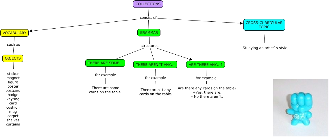 Este Cmap, tiene información relacionada con: COLLECTIONS-Eduardo, THERE ARE SOME... for example There are some cards on the table., GRAMMAR structures THERE AREN´T ANY..., CROSS-CURRICULAR TOPIC ???? Studying an artist`s style, ARE THERE ANY...? for example Are there any cards on the table? +Yes, there are. - No there aren´t., VOCABULARY such as OBJECTS, THERE AREN´T ANY... for example There aren´t any cards on the table., GRAMMAR structures ARE THERE ANY...?, GRAMMAR structures THERE ARE SOME..., COLLECTIONS consist of GRAMMAR, COLLECTIONS consist of VOCABULARY, OBJECTS ???? sticker magnet figure poster postcard badge keyring card cushion mug carpet shelves curtains, COLLECTIONS consist of CROSS-CURRICULAR TOPIC