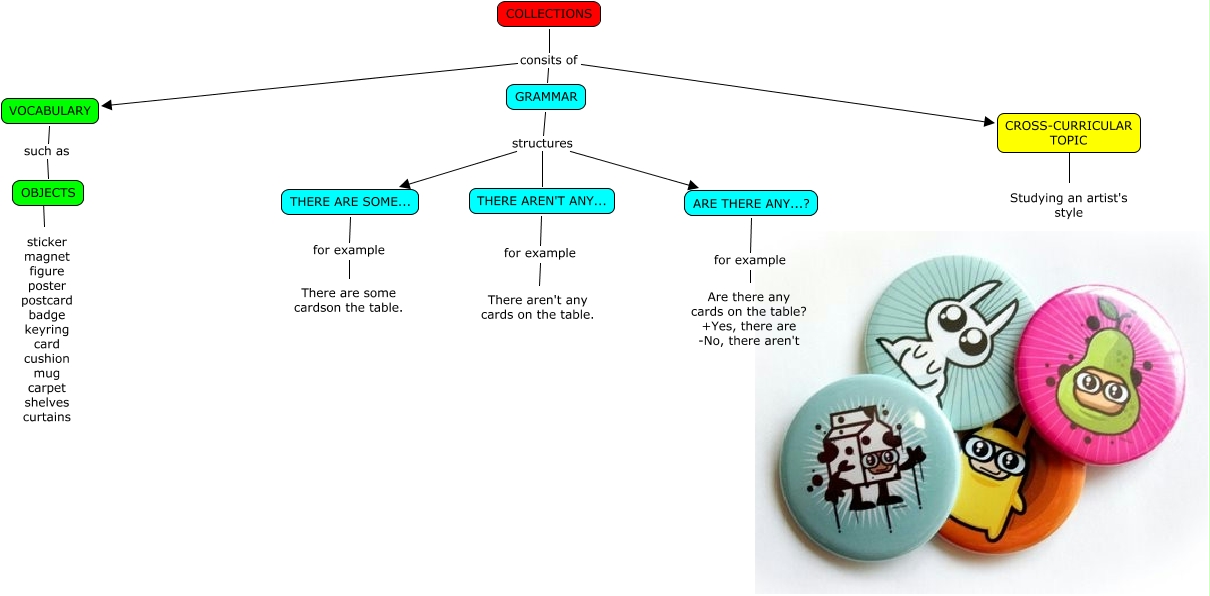 Este Cmap, tiene información relacionada con: COLLECTIONS-Joaquín, COLLECTIONS consits of GRAMMAR, THERE AREN'T ANY... for example There aren't any cards on the table., ARE THERE ANY...? for example Are there any cards on the table? +Yes, there are -No, there aren't, VOCABULARY such as OBJECTS, GRAMMAR structures ARE THERE ANY...?, GRAMMAR structures THERE AREN'T ANY..., OBJECTS ???? sticker magnet figure poster postcard badge keyring card cushion mug carpet shelves curtains, COLLECTIONS consits of VOCABULARY, CROSS-CURRICULAR TOPIC ???? Studying an artist's style, GRAMMAR structures THERE ARE SOME..., THERE ARE SOME... for example There are some cardson the table., COLLECTIONS consits of CROSS-CURRICULAR TOPIC