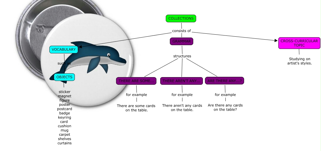 Este Cmap, tiene información relacionada con: COLLECTIONS-Adriana, OBJECTS ???? sticker magnet figure poster postcard badge keyring card cushion mug carpet shelves curtains, THERE AREN'T ANY... for example There aren't any cards on the table., COLLECTIONS consists of CROSS-CURRICULAR TOPIC, VOCABULARY such as OBJECTS, COLLECTIONS consists of GRAMMAR, COLLECTIONS consists of VOCABULARY, CROSS-CURRICULAR TOPIC ???? Studying on artist's styles., GRAMMAR structures ARE THERE ANY...?, GRAMMAR structures THERE AREN'T ANY..., ARE THERE ANY...? for example Are there any cards on the table?, THERE ARE SOME... for example There are some cards on the table., GRAMMAR structures THERE ARE SOME...