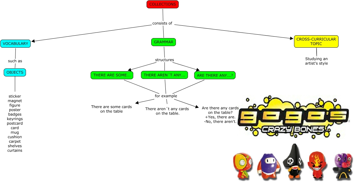 Este Cmap, tiene información relacionada con: COLLECTIONS-Diego, ARE THERE ANY...? for example Are there any cards on the table? +Yes, there are. -No, there aren't., COLLECTIONS consists of CROSS-CURRICULAR TOPIC, OBJECTS ???? sticker magnet figure poster badges keyrings postcard card mug cushion carpet shelves curtains, GRAMMAR structures THERE AREN´T ANY..., THERE ARE SOME... for example Are there any cards on the table? +Yes, there are. -No, there aren't., ARE THERE ANY...? for example There are some cards on the table, THERE AREN´T ANY... for example Are there any cards on the table? +Yes, there are. -No, there aren't., COLLECTIONS consists of VOCABULARY, ARE THERE ANY...? for example There aren´t any cards on the table., GRAMMAR structures ARE THERE ANY...?, CROSS-CURRICULAR TOPIC Studying an artist's style ????, VOCABULARY such as OBJECTS, THERE ARE SOME... for example There aren´t any cards on the table., THERE ARE SOME... for example There are some cards on the table, COLLECTIONS consists of GRAMMAR, THERE AREN´T ANY... for example There aren´t any cards on the table., GRAMMAR structures THERE ARE SOME..., THERE AREN´T ANY... for example There are some cards on the table