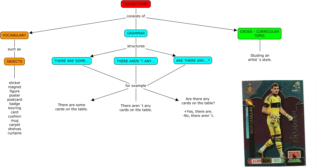 Este Cmap, tiene información relacionada con: COLLECTIONS-Beatriz, COLLECTIONS consists of VOCABULARY, ARE THERE ANY...? for example There aren´t any cards on the table., THERE ARE SOME... for example There aren´t any cards on the table., GRAMMAR structures THERE AREN´T ANY..., GRAMMAR structures THERE ARE SOME..., THERE ARE SOME... for example Are there any cards on the table? +Yes, there are. -No, there aren´t., COLLECTIONS consists of GRAMMAR, GRAMMAR structures ARE THERE ANY...?, COLLECTIONS consists of CROSS - CURRICULAR TOPIC, THERE AREN´T ANY... for example There aren´t any cards on the table., ARE THERE ANY...? for example Are there any cards on the table? +Yes, there are. -No, there aren´t., THERE AREN´T ANY... for example There are some cards on the table., VOCABULARY such as OBJECTS, ARE THERE ANY...? for example There are some cards on the table., OBJECTS ???? sticker magnet figure poster postcard badge keyring card cushion mug carpet shelves curtains, THERE ARE SOME... for example There are some cards on the table., CROSS - CURRICULAR TOPIC ???? Studing an artist´s style., THERE AREN´T ANY... for example Are there any cards on the table? +Yes, there are. -No, there aren´t.