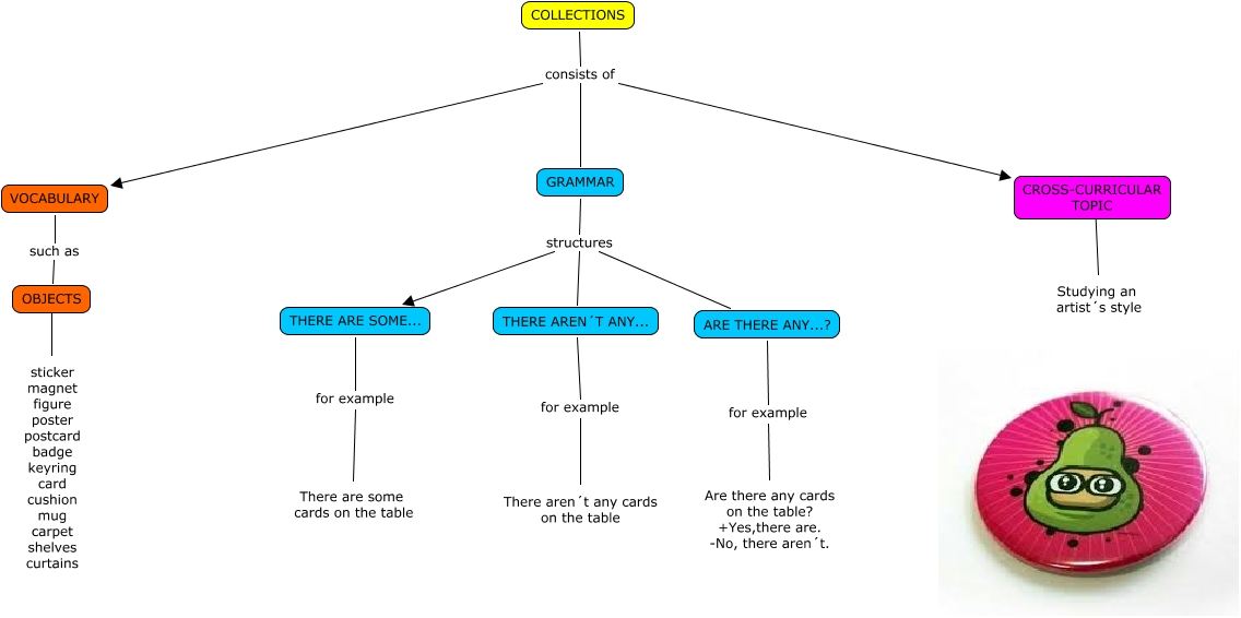 Este Cmap, tiene información relacionada con: COLLECTIONS-Lucía M, CROSS-CURRICULAR TOPIC ???? Studying an artist´s style, COLLECTIONS consists of CROSS-CURRICULAR TOPIC, GRAMMAR structures ARE THERE ANY...?, COLLECTIONS consists of VOCABULARY, ARE THERE ANY...? for example Are there any cards on the table? +Yes,there are. -No, there aren´t., THERE ARE SOME... for example There are some cards on the table, VOCABULARY such as OBJECTS, THERE AREN´T ANY... for example There aren´t any cards on the table, GRAMMAR structures THERE AREN´T ANY..., OBJECTS ???? sticker magnet figure poster postcard badge keyring card cushion mug carpet shelves curtains, COLLECTIONS consists of GRAMMAR, GRAMMAR structures THERE ARE SOME...