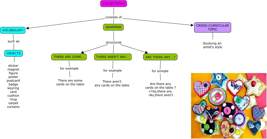 Este Cmap, tiene información relacionada con: COLLECTIONS-Sofía, THERE ARE SOME... for example There are some cards on the table, VOCABULARY such as OBJECTS, COLLECTIONS consists of VOCABULARY, GRAMMAR structures ARE THERE ANY...?, THERE AREN'T ANY... for example There aren't any cards on the table, GRAMMAR structures THERE ARE SOME..., OBJECTS ???? sticker magnet figure poster postcard badge keyring card cushion mug carpet curtains, CROSS-CURRICULAR TOPIC ???? Studying an artist's style, ARE THERE ANY...? for exmple Are there any cards on the table ? +Yes,there are. -No,there aren't, COLLECTIONS consists of GRAMMAR, GRAMMAR structures THERE AREN'T ANY..., COLLECTIONS consists of CROSS-CURRICULAR TOPIC