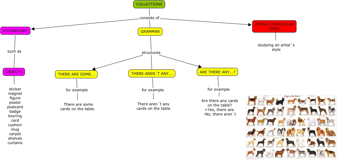 Este Cmap, tiene información relacionada con: COLLECTIONS-Rodrigo, THERE AREN´T ANY... for example There aren´t any cards on the table., OBJECTS ???? sticker magnet figure poster postcard badge keyring card cushion mug carpet shelves curtains, COLLECTIONS consists of GRAMMAR, GRAMMAR structures THERE AREN´T ANY..., VOCABULARY such as OBJECTS, CROSS-CURRICULAR TOPIC ???? studying an artist´s style, COLLECTIONS consists of CROSS-CURRICULAR TOPIC, THERE ARE SOME... for example There are some cards on the table., GRAMMAR structures ARE THERE ANY...?, GRAMMAR structures THERE ARE SOME..., COLLECTIONS consists of VOCABULARY, ARE THERE ANY...? for example Are there any cards on the table? +Yes, there are. -No, there aren´t