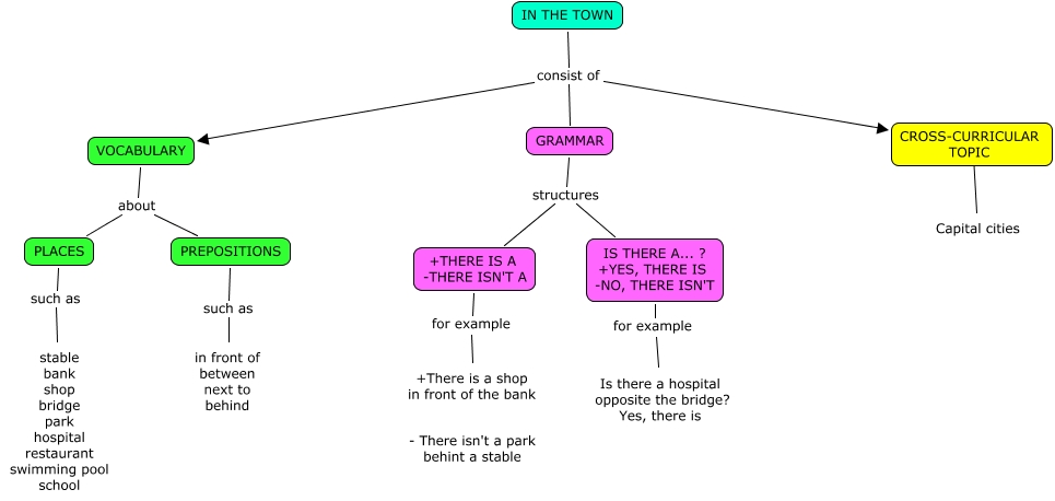 Este Cmap, tiene información relacionada con: IN THE TOWN- María, IN THE TOWN consist of GRAMMAR, IN THE TOWN consist of CROSS-CURRICULAR TOPIC, GRAMMAR structures +THERE IS A -THERE ISN'T A, IS THERE A... ? +YES, THERE IS -NO, THERE ISN'T for example Is there a hospital opposite the bridge? Yes, there is, IN THE TOWN consist of VOCABULARY, GRAMMAR structures IS THERE A... ? +YES, THERE IS -NO, THERE ISN'T, VOCABULARY about PLACES, +THERE IS A -THERE ISN'T A for example +There is a shop in front of the bank, PREPOSITIONS such as in front of between next to behind, CROSS-CURRICULAR TOPIC Capital topic Capital cities, VOCABULARY about PREPOSITIONS, PLACES such as stable bank shop bridge park hospital restaurant swimming pool school