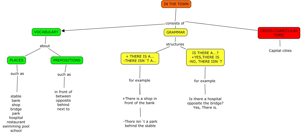 Este Cmap, tiene información relacionada con: IN THE TOWN-Carlos, PREPOSITIONS such as in front of between opposite behind next to, CROSS-CURRICULAR TOPIC consists of VOCABULARY, + THERE IS A... -THERE ISN´T A... for example -There isn´t a park behind the stable, CROSS-CURRICULAR TOPIC consists of GRAMMAR, IS THERE A...? +YES,THERE IS -NO, THERE ISN´T for example Is there a hospital opposite the bridge? Yes, There is., IN THE TOWN consists of VOCABULARY, GRAMMAR structures + THERE IS A... -THERE ISN´T A..., VOCABULARY about PREPOSITIONS, IN THE TOWN consists of GRAMMAR, + THERE IS A... -THERE ISN´T A... for example +There is a shop in front of the bank, GRAMMAR structures IS THERE A...? +YES,THERE IS -NO, THERE ISN´T, CROSS-CURRICULAR TOPIC ???? Capital cities, VOCABULARY about PLACES, PLACES such as stable bank shop bridge park hospital restaurant swimming pool school