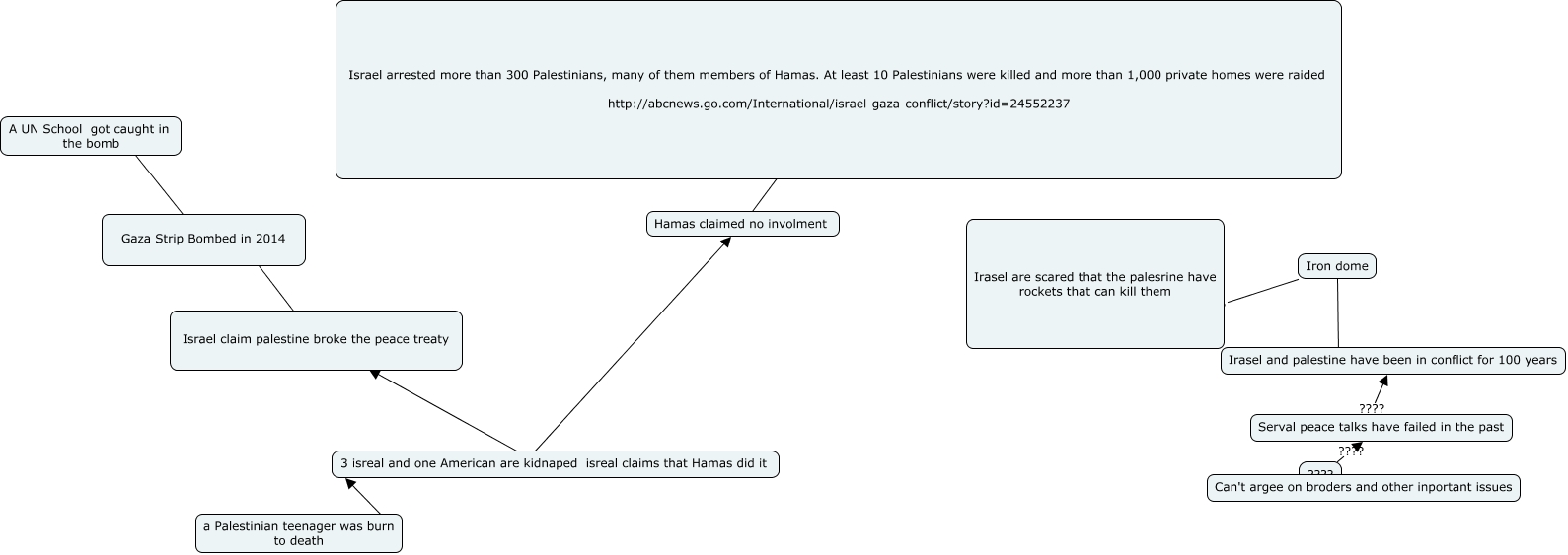 This Concept Map, created with IHMC CmapTools, has information related to: Start of the 2014 conflict, 3 isreal and one American are kidnaped isreal claims that Hamas did it ???? Hamas claimed no involment, 3 isreal and one American are kidnaped isreal claims that Hamas did it ???? Israel claim palestine broke the peace treaty, A UN School got caught in the bomb ???? Gaza Strip Bombed in 2014, Serval peace talks have failed in the past ???? Irasel and palestine have been in conflict for 100 years, Iron dome ???? Irasel are scared that the palesrine have rockets that can kill them, Israel arrested more than 300 Palestinians, many of them members of Hamas. At least 10 Palestinians were killed and more than 1,000 private homes were raided http://abcnews.go.com/International/israel-gaza-conflict/story?id=24552237 ???? Hamas claimed no involment, Iron dome ???? Irasel and palestine have been in conflict for 100 years, ???? ???? Serval peace talks have failed in the past, a Palestinian teenager was burn to death ???? 3 isreal and one American are kidnaped isreal claims that Hamas did it, Israel claim palestine broke the peace treaty ???? Gaza Strip Bombed in 2014