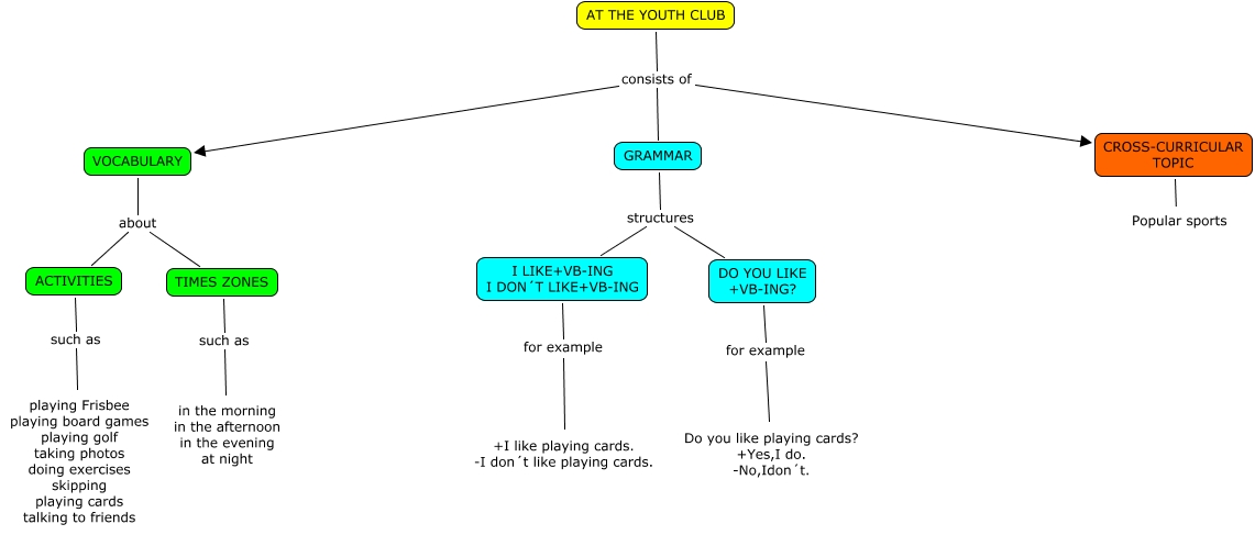 Este Cmap, tiene información relacionada con: Martina-AT THE YOUTH CLUB, GRAMMAR structures DO YOU LIKE +VB-ING?, AT THE YOUTH CLUB consists of GRAMMAR, TIMES ZONES such as in the morning in the afternoon in the evening at night, DO YOU LIKE +VB-ING? for example Do you like playing cards? +Yes,I do. -No,Idon´t., I LIKE+VB-ING I DON´T LIKE+VB-ING for example +I like playing cards. -I don´t like playing cards., VOCABULARY about TIMES ZONES, ACTIVITIES such as playing Frisbee playing board games playing golf taking photos doing exercises skipping playing cards talking to friends, GRAMMAR structures I LIKE+VB-ING I DON´T LIKE+VB-ING, AT THE YOUTH CLUB consists of VOCABULARY, VOCABULARY about ACTIVITIES, CROSS-CURRICULAR TOPIC ???? Popular sports, AT THE YOUTH CLUB consists of CROSS-CURRICULAR TOPIC