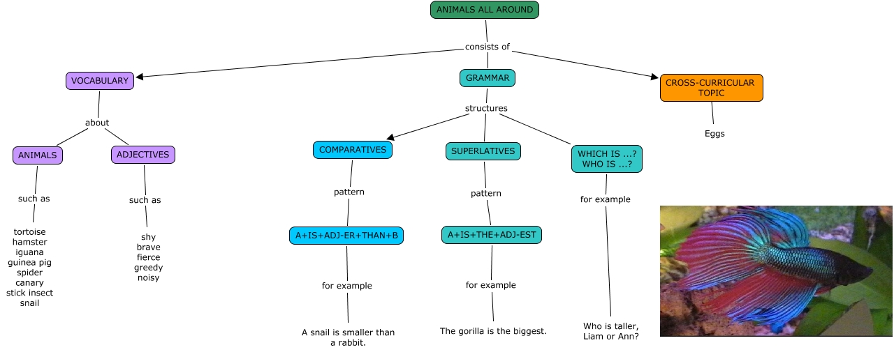 Este Cmap, tiene información relacionada con: ANIMALS ALL AROUND-Claudia, ANIMALS ALL AROUND consists of GRAMMAR, ANIMALS such as tortoise hamster iguana guinea pig spider canary stick insect snail, SUPERLATIVES pattern A+IS+THE+ADJ-EST, ANIMALS ALL AROUND consists of CROSS-CURRICULAR TOPIC, A+IS+ADJ-ER+THAN+B for example A snail is smaller than a rabbit., GRAMMAR structures SUPERLATIVES, GRAMMAR structures COMPARATIVES, GRAMMAR structures WHICH IS ...? WHO IS ...?, A+IS+THE+ADJ-EST for example The gorilla is the biggest., WHICH IS ...? WHO IS ...? for example Who is taller, Liam or Ann?, VOCABULARY about ANIMALS, CROSS-CURRICULAR TOPIC ???? Eggs, VOCABULARY about ADJECTIVES, COMPARATIVES pattern A+IS+ADJ-ER+THAN+B, ADJECTIVES such as shy brave fierce greedy noisy, ANIMALS ALL AROUND consists of VOCABULARY