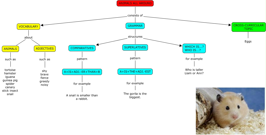 Este Cmap, tiene información relacionada con: ANIMALS ALL AROUND-Beatriz, ANIMALS such as tortoise hamster iguana guinea pig spider canary stick insect snail, CROSS-CURRICULAR TOPIC ???? Eggs, A+IS+THE+ADJ.-EST for example The gorila is the biggest., COMPARATIVES pattern A+IS+ADJ.-ER+THAN+B, WHICH IS...? WHO IS...? for example Who is taller Liam or Ann?, GRAMMAR structures SUPERLATIVES, A+IS+ADJ.-ER+THAN+B for example A snail is smaller than a rabbit., ANIMALS ALL AROUND consists of CROSS-CURRICULAR TOPIC, VOCABULARY about ANIMALS, SUPERLATIVES pattern A+IS+THE+ADJ.-EST, GRAMMAR structures WHICH IS...? WHO IS...?, ADJECTIVES such as shy brave fierce greedy noisy, GRAMMAR structures COMPARATIVES, VOCABULARY about ADJECTIVES, ANIMALS ALL AROUND consists of VOCABULARY, ANIMALS ALL AROUND consists of GRAMMAR
