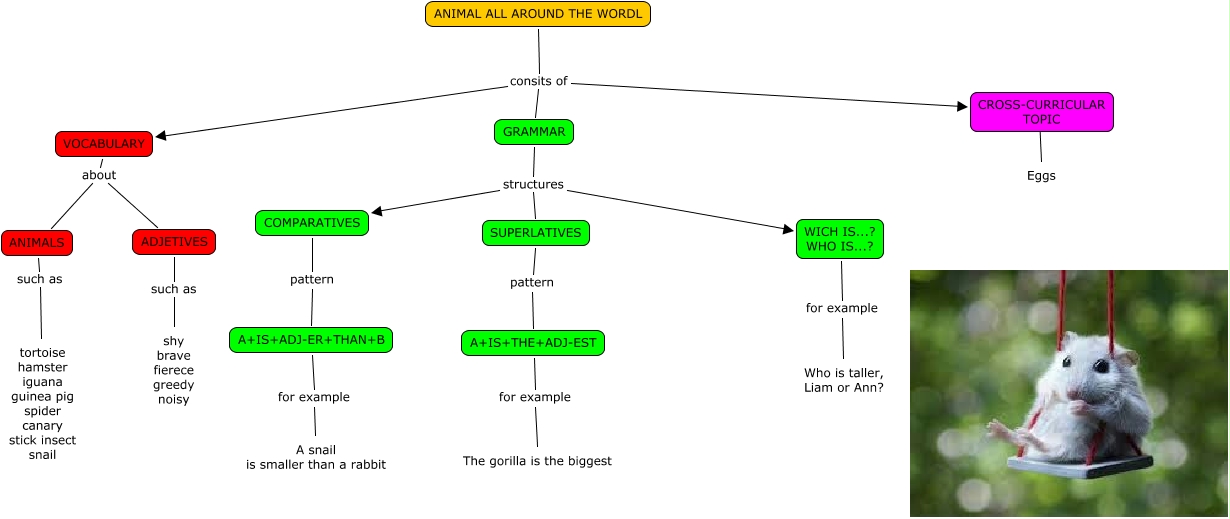 Este Cmap, tiene información relacionada con: ANIMALS ALL AROUNDt-Pablo, ANIMALS such as tortoise hamster iguana guinea pig spider canary stick insect snail, SUPERLATIVES pattern A+IS+THE+ADJ-EST, A+IS+ADJ-ER+THAN+B for example A snail is smaller than a rabbit, COMPARATIVES pattern A+IS+ADJ-ER+THAN+B, A+IS+THE+ADJ-EST for example The gorilla is the biggest, GRAMMAR structures SUPERLATIVES, ANIMAL ALL AROUND THE WORDL consits of VOCABULARY, GRAMMAR structures COMPARATIVES, CROSS-CURRICULAR TOPIC ???? Eggs, ADJETIVES such as shy brave fierece greedy noisy, ANIMAL ALL AROUND THE WORDL consits of GRAMMAR, GRAMMAR structures WICH IS...? WHO IS...?, WICH IS...? WHO IS...? for example Who is taller, Liam or Ann?, ANIMAL ALL AROUND THE WORDL consits of CROSS-CURRICULAR TOPIC, VOCABULARY about ADJETIVES, VOCABULARY about ANIMALS
