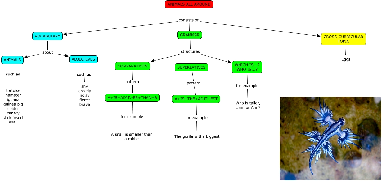 Este Cmap, tiene información relacionada con: ANIMALS ALL AROUND-Diego, ANIMALS such as tortoise hamster iguana guinea pig spider canary stick insect snail, ANIMALS ALL AROUND consists of CROSS-CURRICULAR TOPIC, VOCABULARY about ADJECTIVES, WHICH IS...? WHO IS...? for example Who is taller, Liam or Ann?, COMPARATIVES pattern A+IS+ADJT.-ER+THAN+B, SUPERLATIVES pattern A+IS+THE+ADJT.-EST, ANIMALS ALL AROUND consists of VOCABULARY, ADJECTIVES such as shy greedy noisy fierce brave, CROSS-CURRICULAR TOPIC ???? Eggs, GRAMMAR structures WHICH IS...? WHO IS...?, GRAMMAR structures SUPERLATIVES, GRAMMAR structures COMPARATIVES, A+IS+ADJT.-ER+THAN+B for example A snail is smaller than a rabbit, VOCABULARY about ANIMALS, ANIMALS ALL AROUND consists of GRAMMAR, A+IS+THE+ADJT.-EST for example The gorila is the biggest