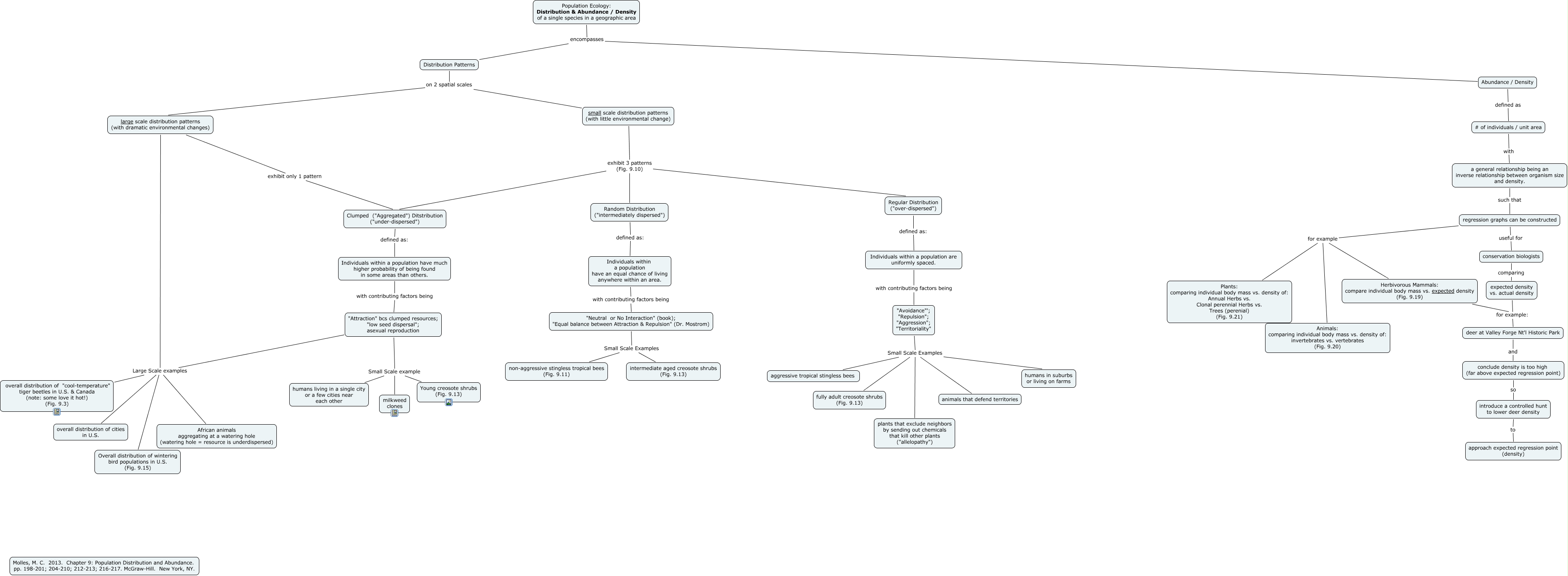 This Concept Map, created with IHMC CmapTools, has information related to: Pop Distn Density Ch9 021315 copy, large scale distribution patterns (with dramatic environmental changes) Large Scale examples African animals aggregating at a watering hole (watering hole = resource is underdispersed), regression graphs can be constructed for example Animals: comparing individual body mass vs. density of: invertebrates vs. vertebrates (Fig. 9.20), Distribution Patterns on 2 spatial scales small scale distribution patterns (with little environmental change), Random Distribution ("intermediately dispersed") defined as: Individuals within a population have an equal chance of living anywhere within an area., small scale distribution patterns (with little environmental change) exhibit 3 patterns (Fig. 9.10) Clumped ("Aggregated") Ditstribution ("under-dispersed"), regression graphs can be constructed useful for conservation biologists, a general relationship being an inverse relationship between organism size and density. such that regression graphs can be constructed, Population Ecology: Distribution & Abundance / Density of a single species in a geographic area encompasses Distribution Patterns, large scale distribution patterns (with dramatic environmental changes) Large Scale examples overall distribution of cities in U.S., Abundance / Density defined as # of individuals / unit area, "Avoidance"'; "Repulsion"; "Aggression"; "Territoriality" Small Scale Examples plants that exclude neighbors by sending out chemicals that kill other plants ("allelopathy"), Clumped ("Aggregated") Ditstribution ("under-dispersed") defined as: Individuals within a population have much higher probability of being found in some areas than others., Individuals within a population have an equal chance of living anywhere within an area. with contributing factors being "Neutral or No Interaction" (book); "Equal balance between Attraction & Repulsion" (Dr. Mostrom), deer at Valley Forge Nt'l Historic Park and conclude density is too high (far above expected regression point), small scale distribution patterns (with little environmental change) exhibit 3 patterns (Fig. 9.10) Regular Distribution ("over-dispersed"), "Attraction" bcs clumped resources; "low seed dispersal"; asexual reproduction Large Scale examples overall distribution of cities in U.S., # of individuals / unit area with a general relationship being an inverse relationship between organism size and density., conclude density is too high (far above expected regression point) so introduce a controlled hunt to lower deer density, large scale distribution patterns (with dramatic environmental changes) Large Scale examples Overall distribution of wintering bird populations in U.S. (Fig. 9.15), large scale distribution patterns (with dramatic environmental changes) Large Scale examples overall distribution of "cool-temperature" tiger beetles in U.S. & Canada (note: some love it hot!) (Fig. 9.3)